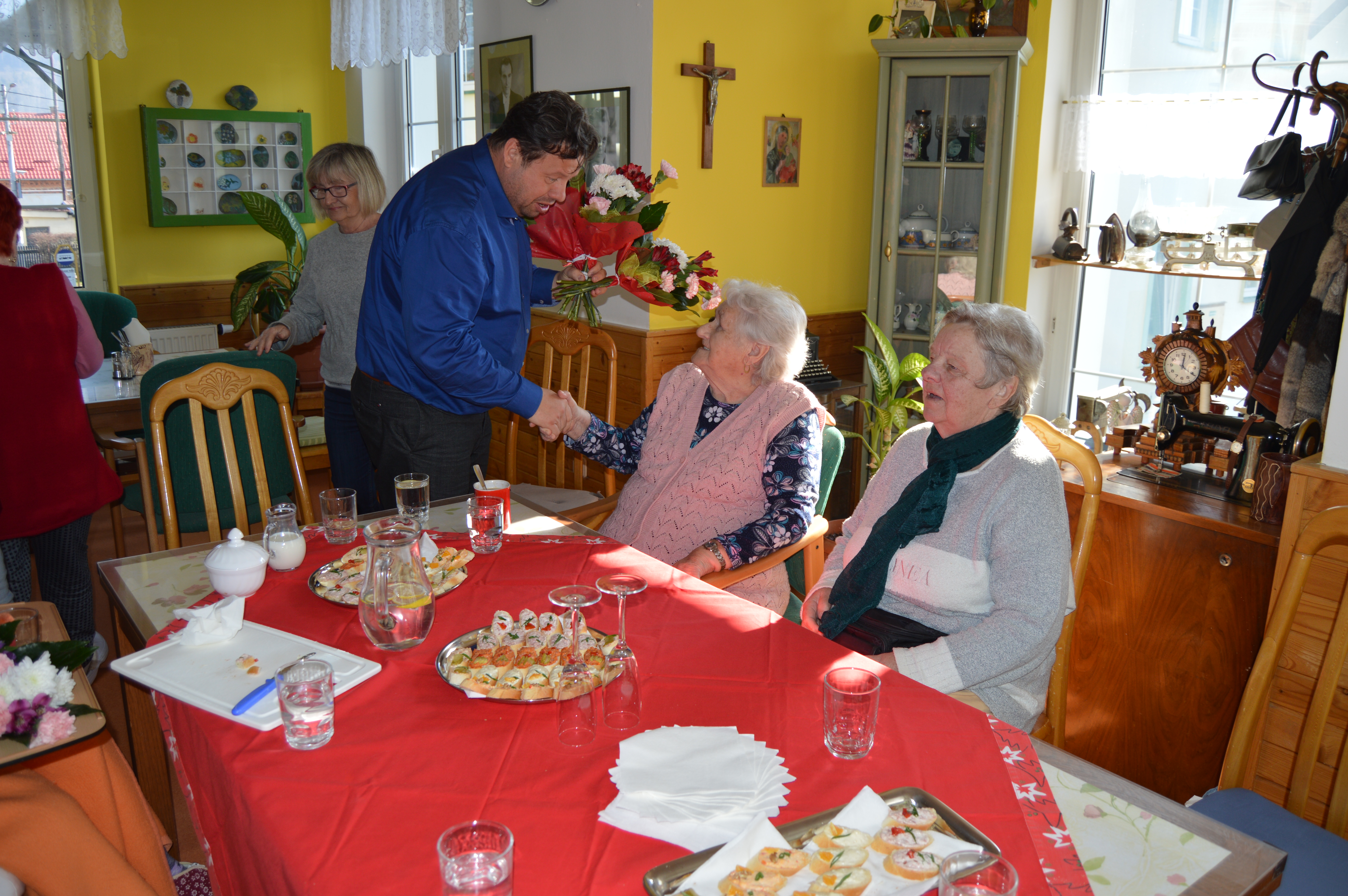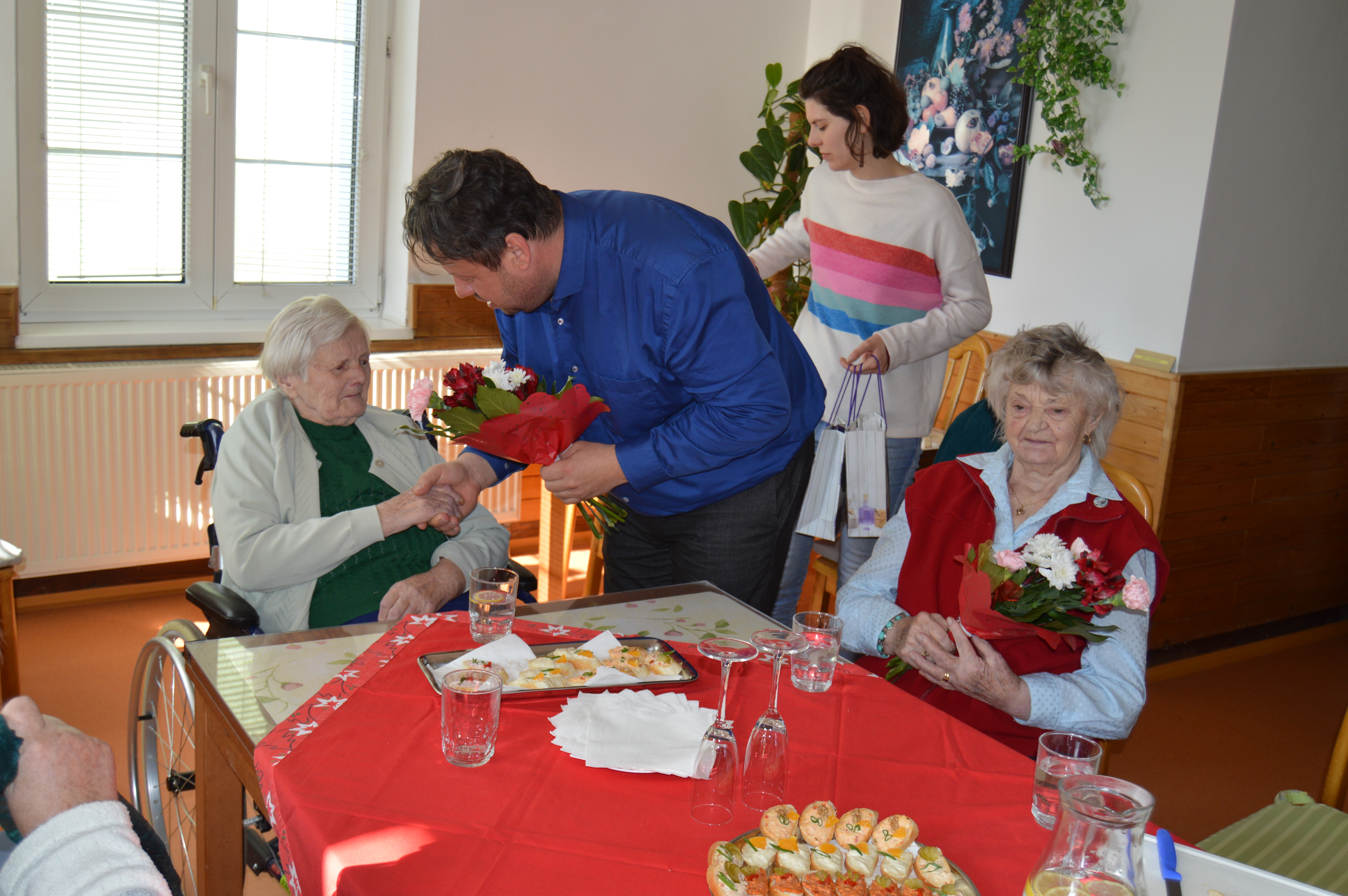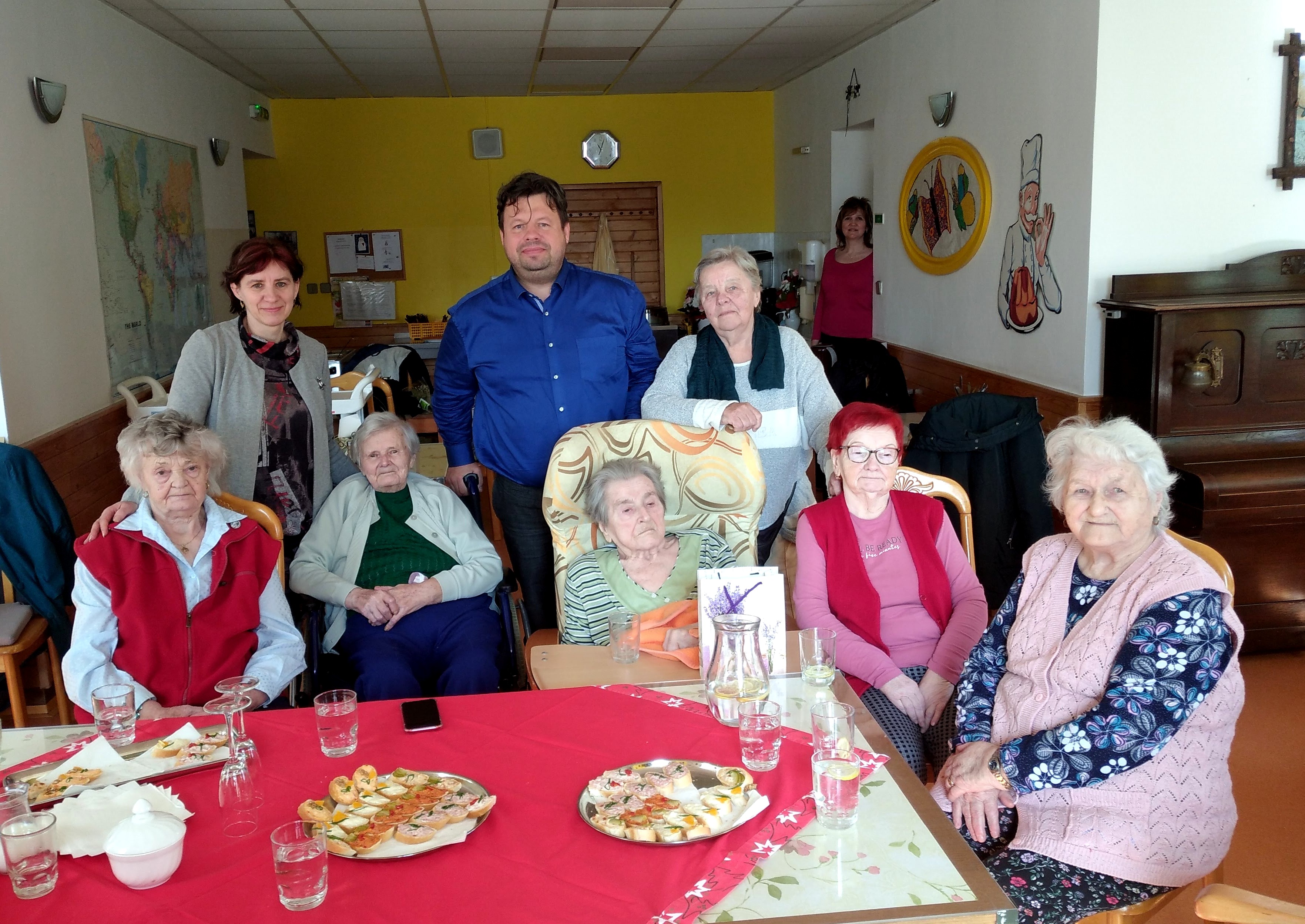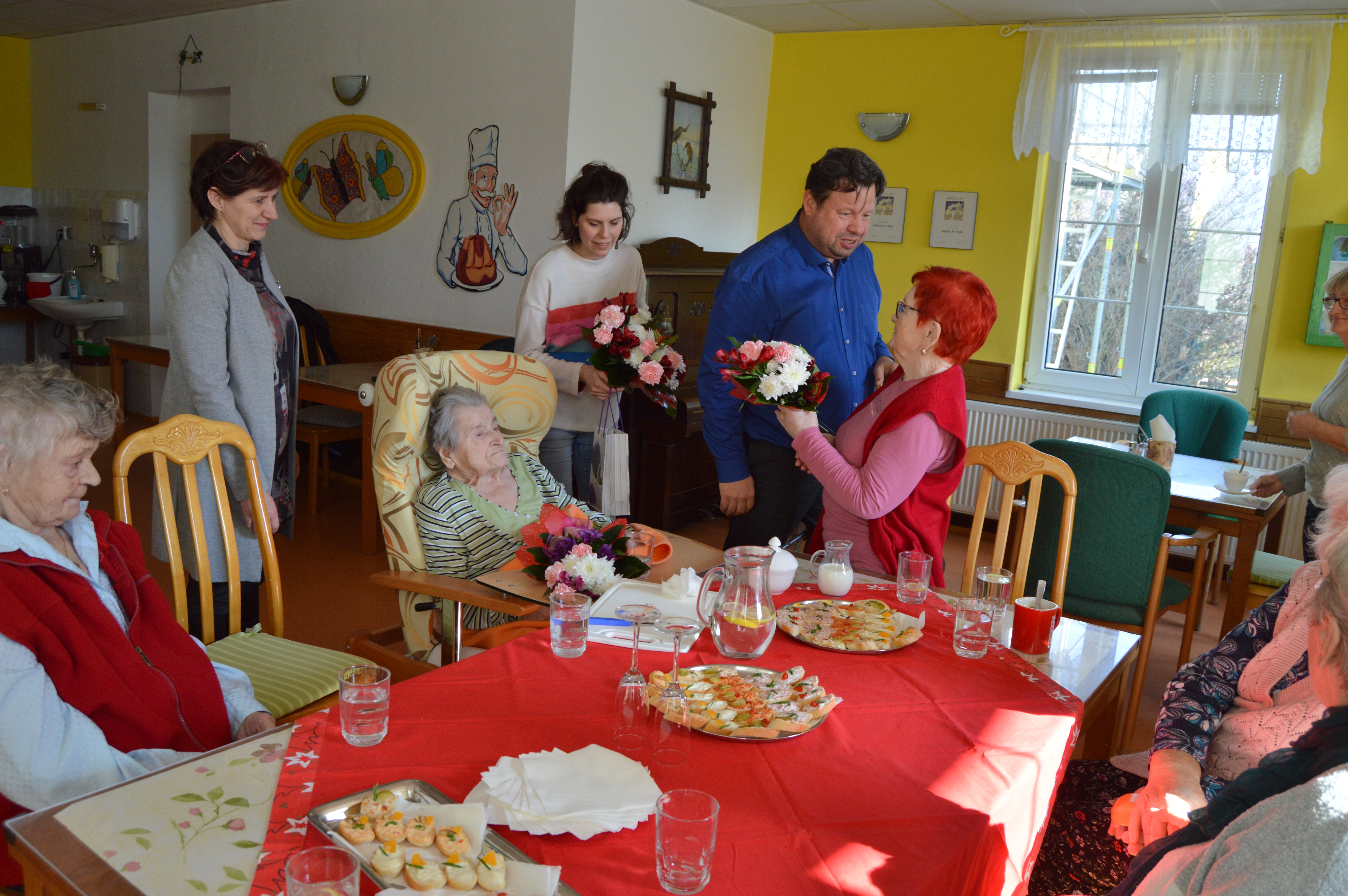 Dne 2.3. jsme měli v Domově návštěvu – pana starostu z Vražného. Bylo naplánováno posezení s ním a s uživatelkami, které žily ve Vražném. Pan starosta na přivítanou rozdal klientkám dáreček a květiny. Bylo přichystáno drobné občerstvení. Všichni si společně při šálku dobré kávy užili pěkné dopoledne a zavzpomínali si na dřívější časy. Pan starosta představil i své plány a jaké změny se v obci chystají. Děkujeme panu starostovi za milou návštěvu, že myslí na seniory.