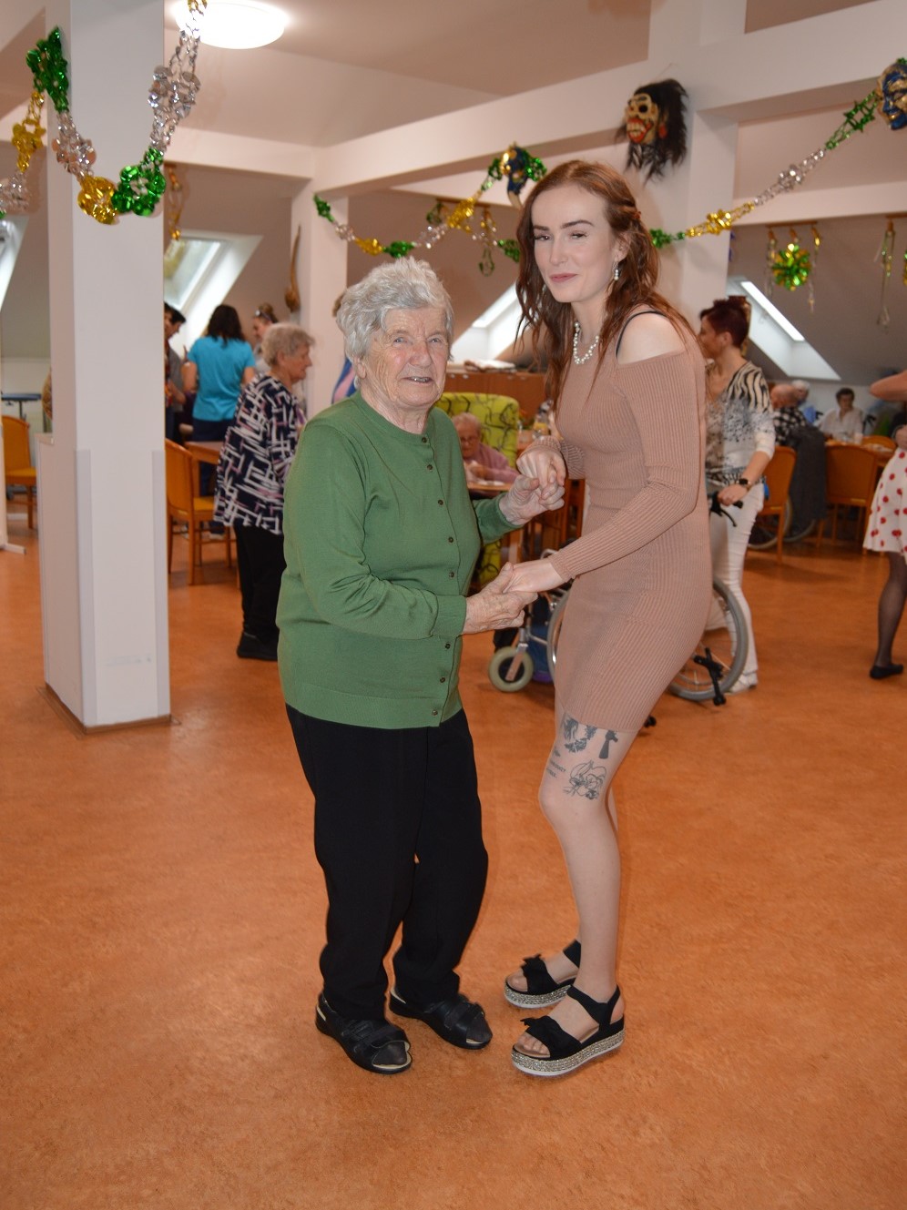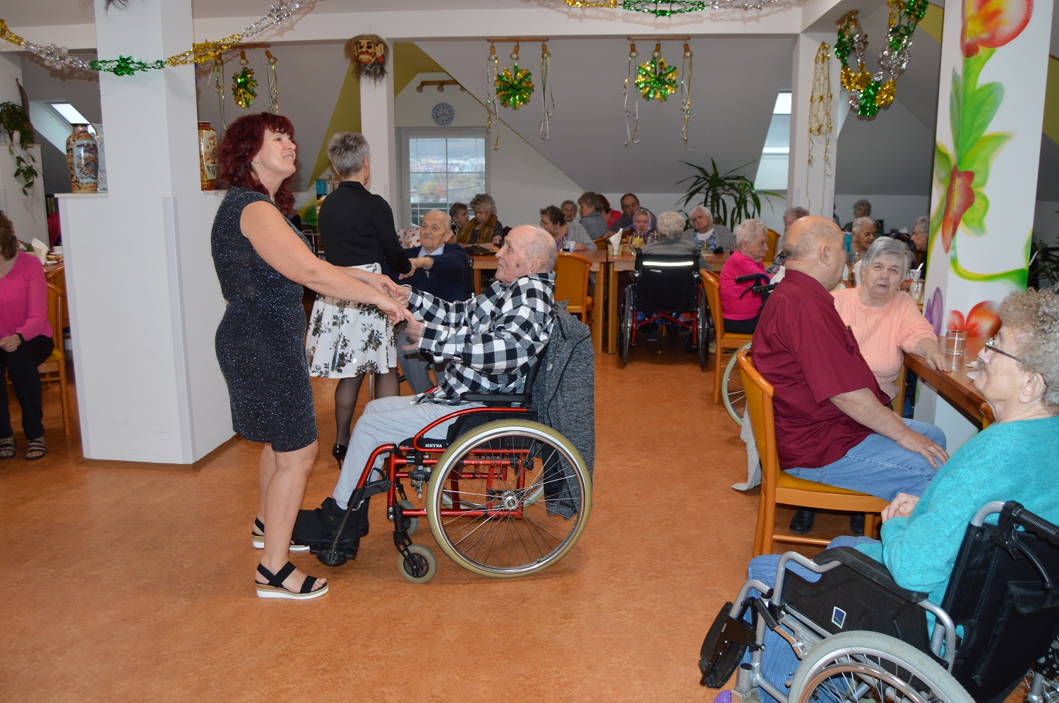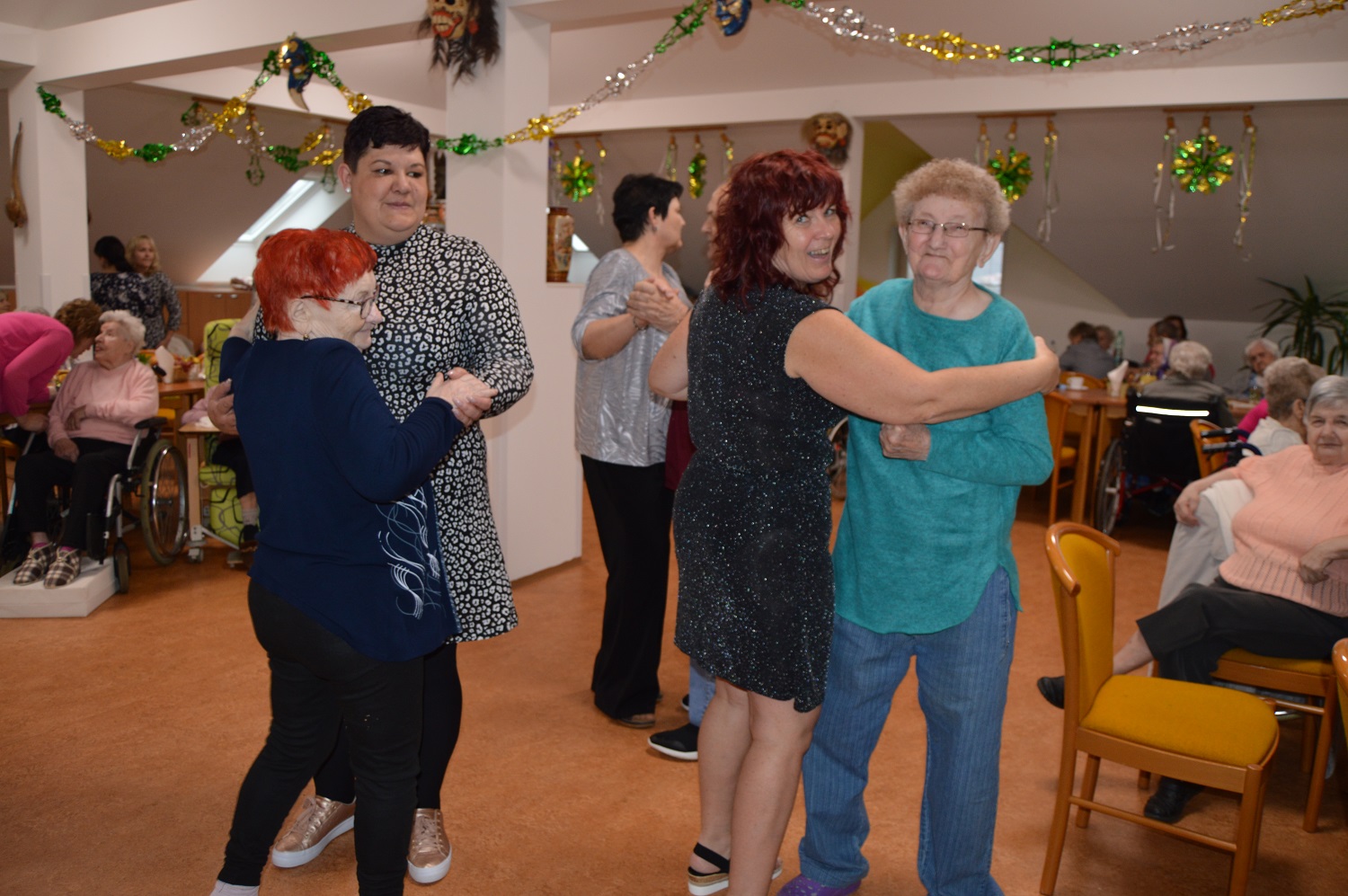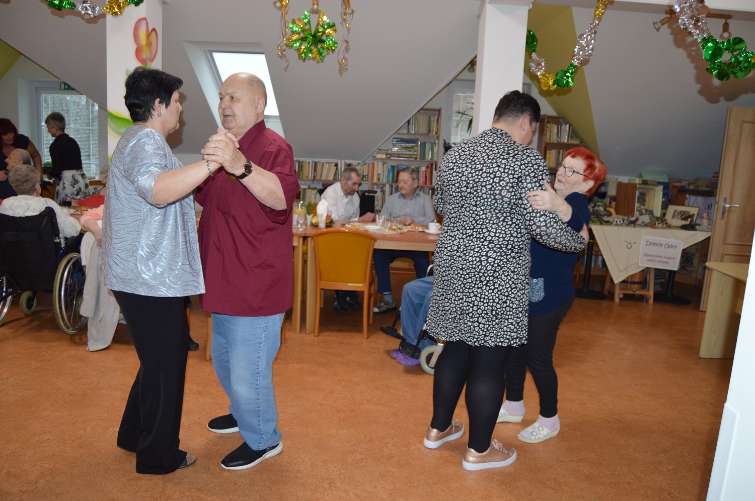 Dne 30.3. se naši uživatelé konečně dočkali po dlouhých třech letech tradičního plesu v Domově. Pracovnice pomohly uživatelům s úpravou a oblečením a doprovodily je do vyzdobené Tančírny. Čekalo tam na ně bohaté občerstvení z naší kuchyně a tombola, která byla plná balíčků ze sponzorských darů, za které dárcům velmi děkujeme. Štěstí a šťastnou ruku při výběru losu v tombole měli všichni uživatelé, každý uživatel vyhrál balíček. Klienti si ples velmi užívali, šlo to vidět na jejich usměvavých tvářích. Někteří si užívali přítomnost svých blízkých, další si prozpěvovali známé písně, o které nebylo nouze a někteří uživatelé si i zatancovali. Jako zpestření podvečera přijal pozvání taneční soubor Lentilky z Mankovic, který pro naše uživatele vystoupil zcela zdarma. Při té příležitosti předaly tanečnice dárek bývalé ředitelce školky z Mankovic paní K.Č., která byla z jejich krásných vystoupení velmi dojatá. Velmi děkujeme za jejich krásné a působivé vystoupení. Ples se chýlil ke konci a klienti se spokojeně vraceli do svých pokojů s pozitivními zážitky a už teď se těší na další akci. Děkujeme pracovníkům za přípravu plesu.