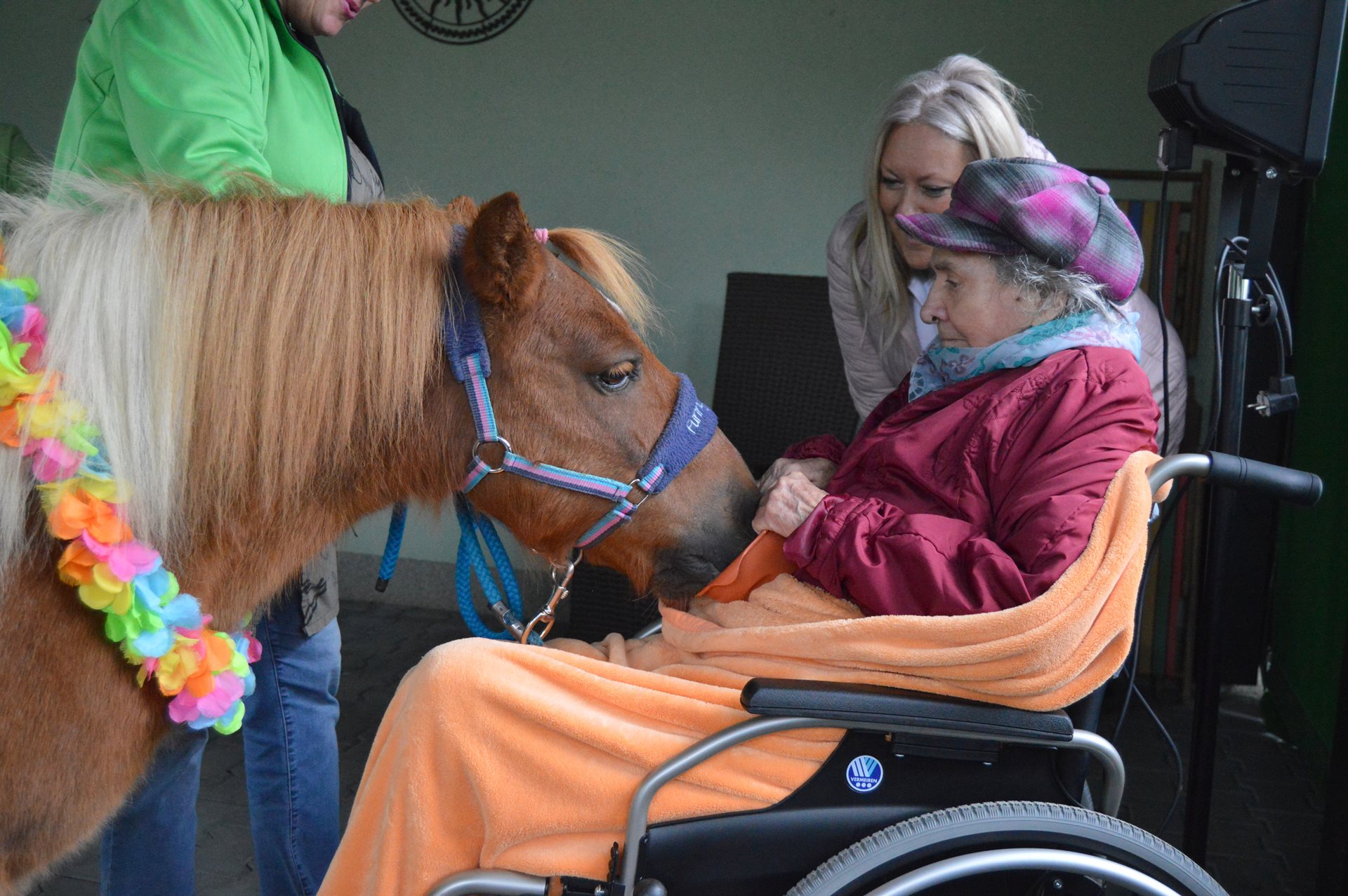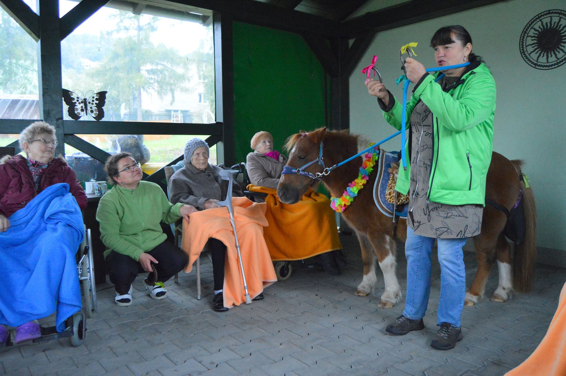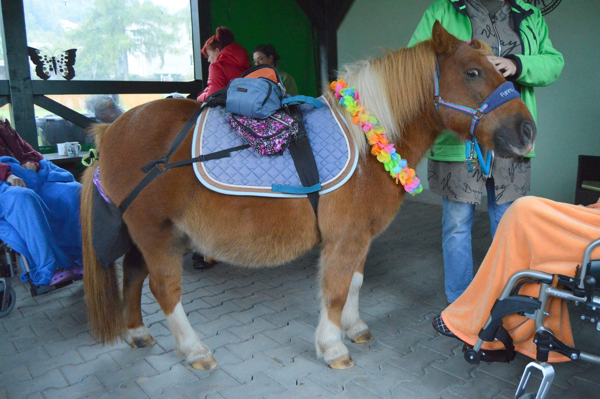 Ve středu 1.října proběhla pro uživatele oblíbená Ponyterapie s poníkem Ondráškem, kterého už klienti dobře znají. Kvůli sychravému počasí se sešli v zahradě v altánu. Nejdříve si poslechli pár zajímavostí ze života Shetlandského poníka, následně si ho mohli pohladit, pomazlit se s ním a vyčesat mu hřívu. Na závěr ho nakrmili z misky nakrájenou mrkvičkou a suchým chlebem. Na přání uživatelů se jim na památku zhotovily fotografie s Ondráškem. Návštěvy zvířátek jsou u našich uživatelů velmi oblíbené. Budeme se těšit na příští návštěvu.