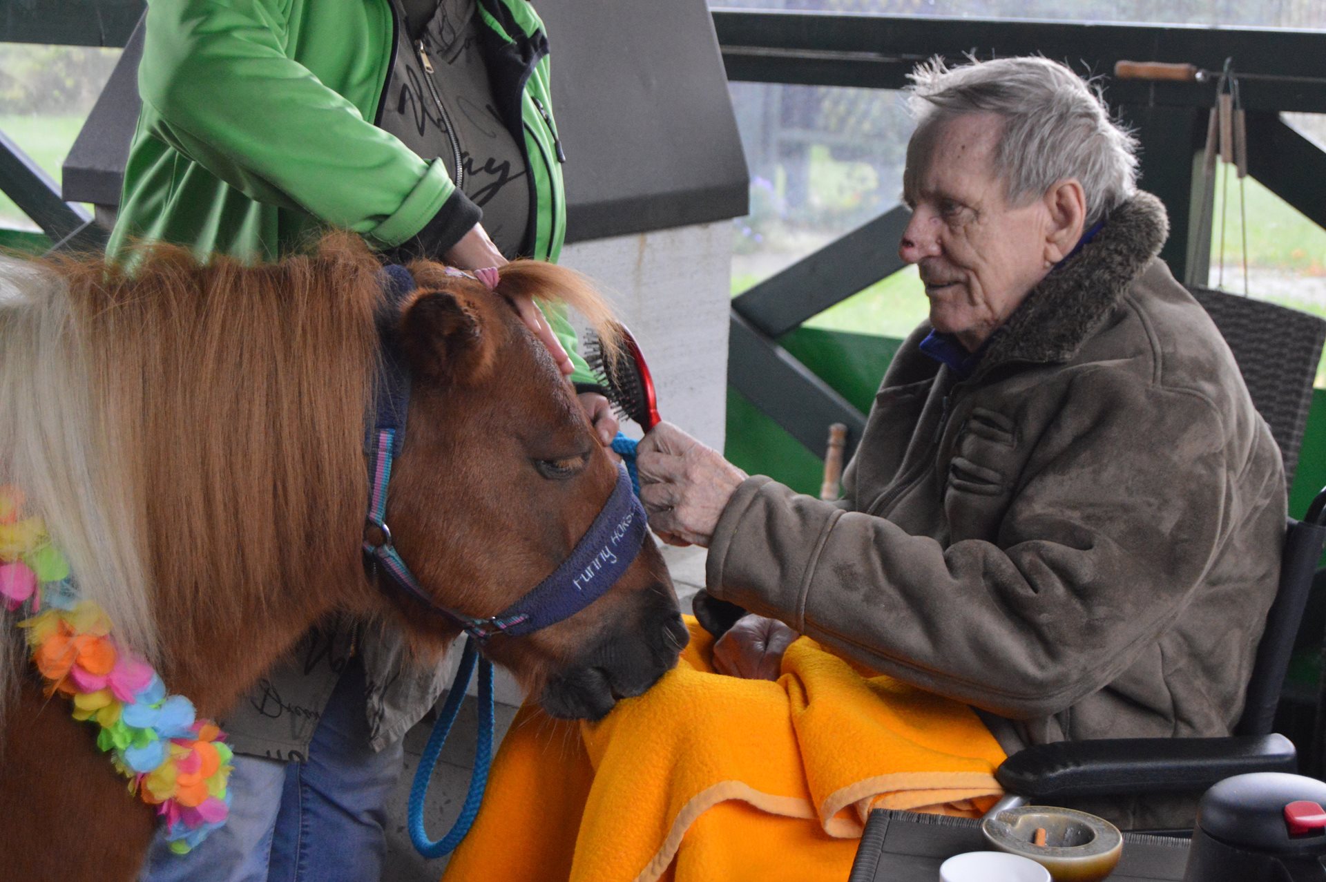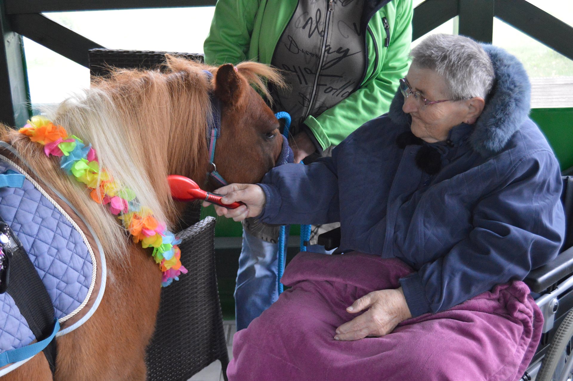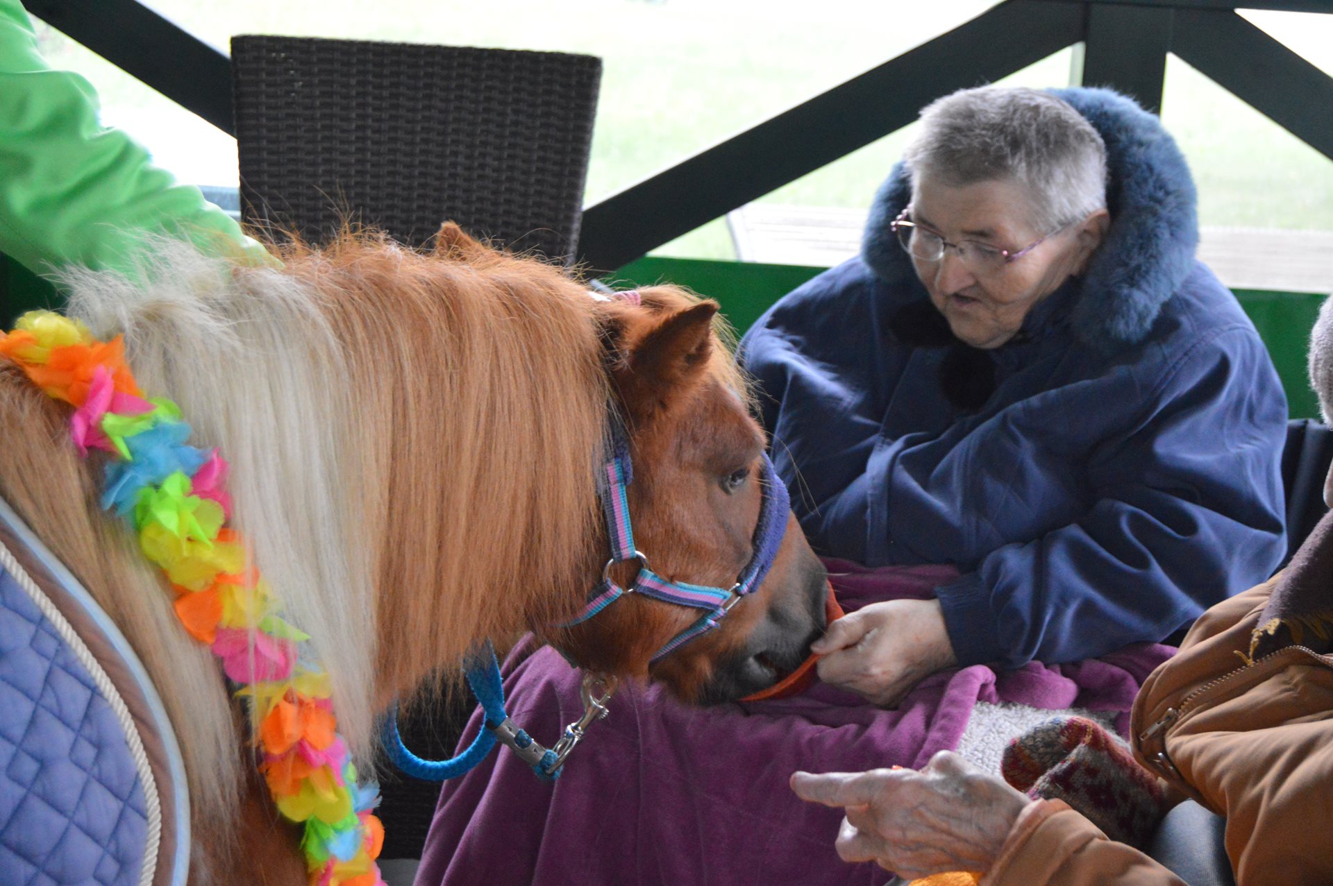 Ve středu 1.října proběhla pro uživatele oblíbená Ponyterapie s poníkem Ondráškem, kterého už klienti dobře znají. Kvůli sychravému počasí se sešli v zahradě v altánu. Nejdříve si poslechli pár zajímavostí ze života Shetlandského poníka, následně si ho mohli pohladit, pomazlit se s ním a vyčesat mu hřívu. Na závěr ho nakrmili z misky nakrájenou mrkvičkou a suchým chlebem. Na přání uživatelů se jim na památku zhotovily fotografie s Ondráškem. Návštěvy zvířátek jsou u našich uživatelů velmi oblíbené. Budeme se těšit na příští návštěvu.