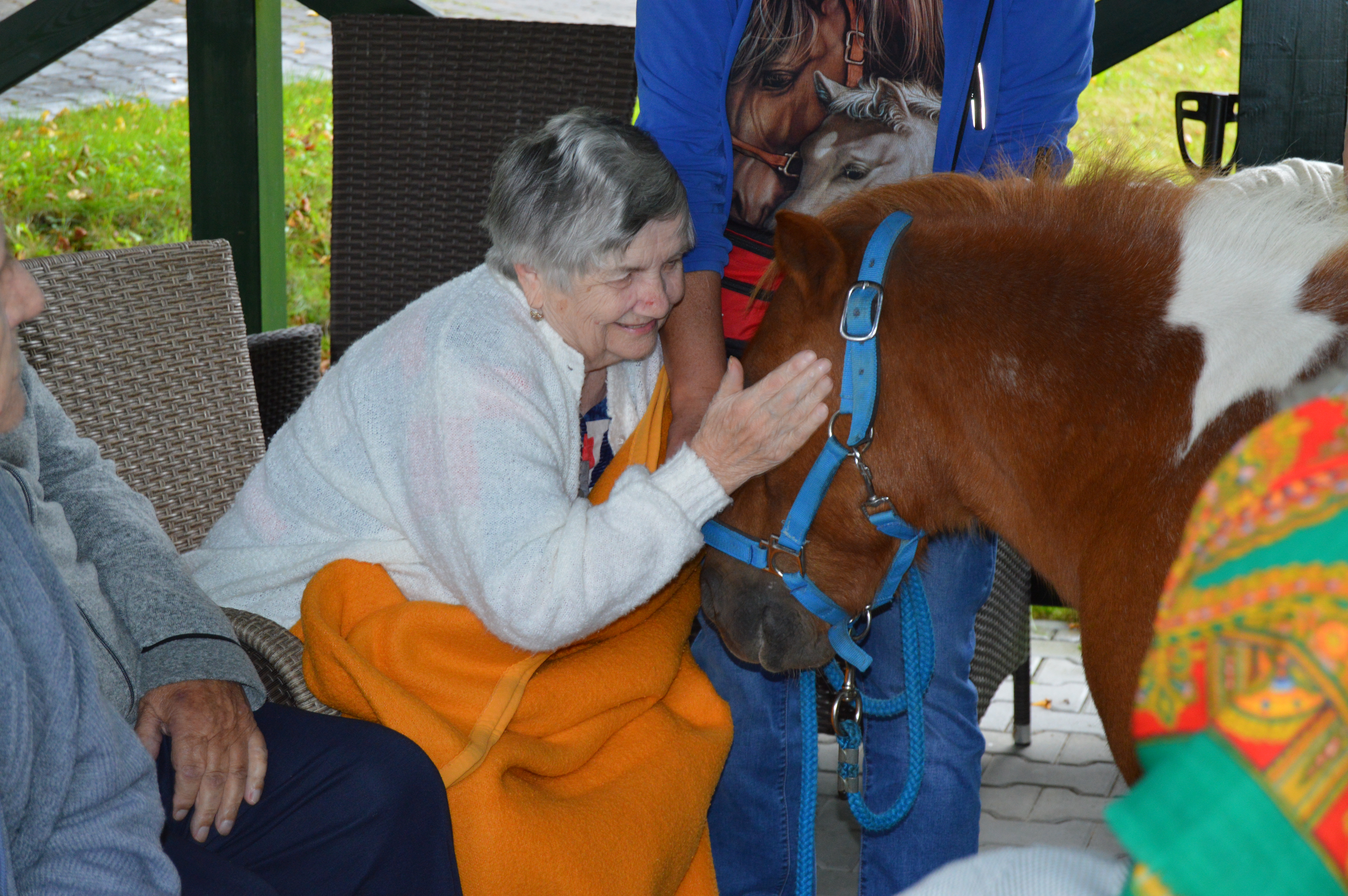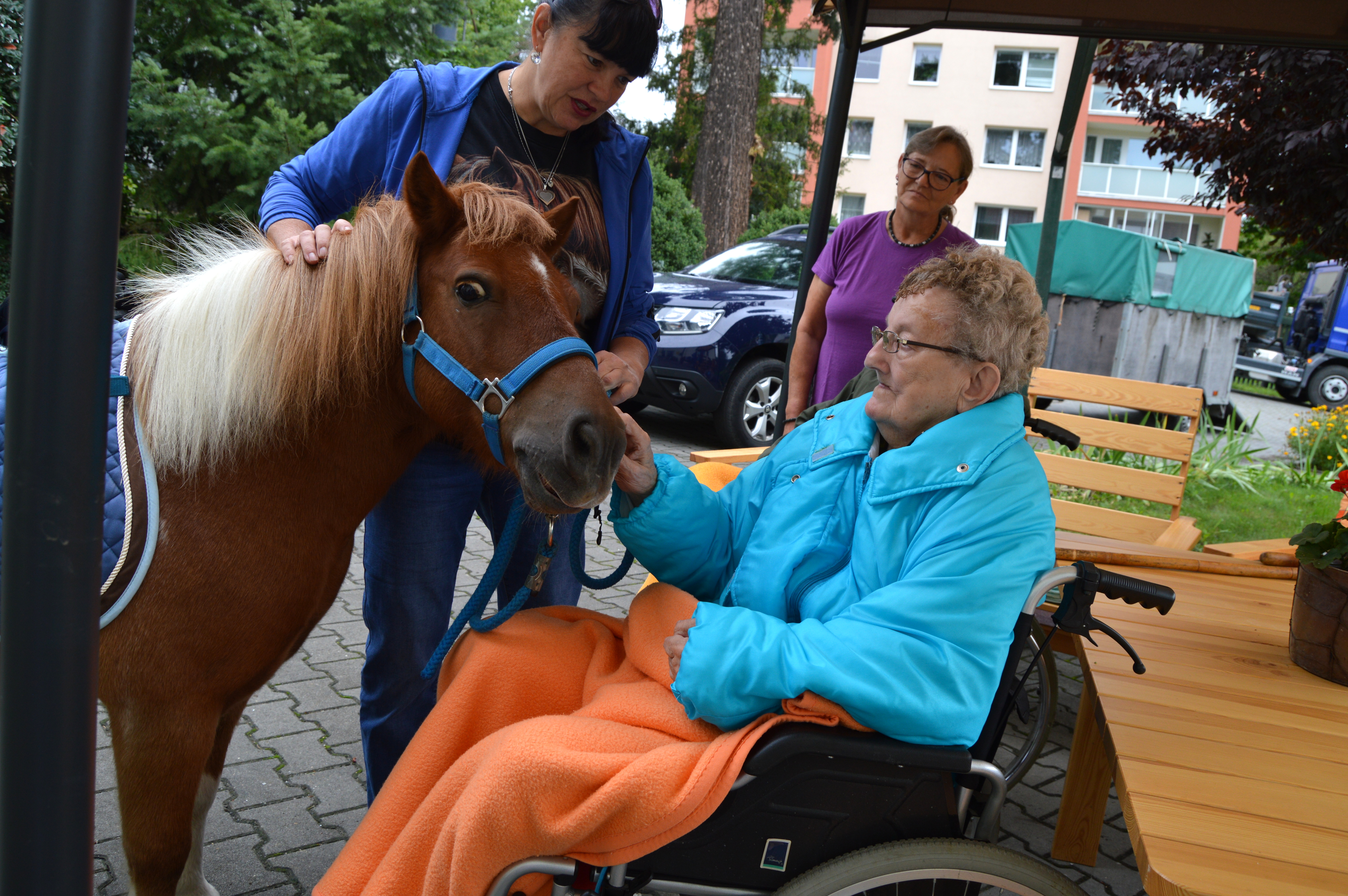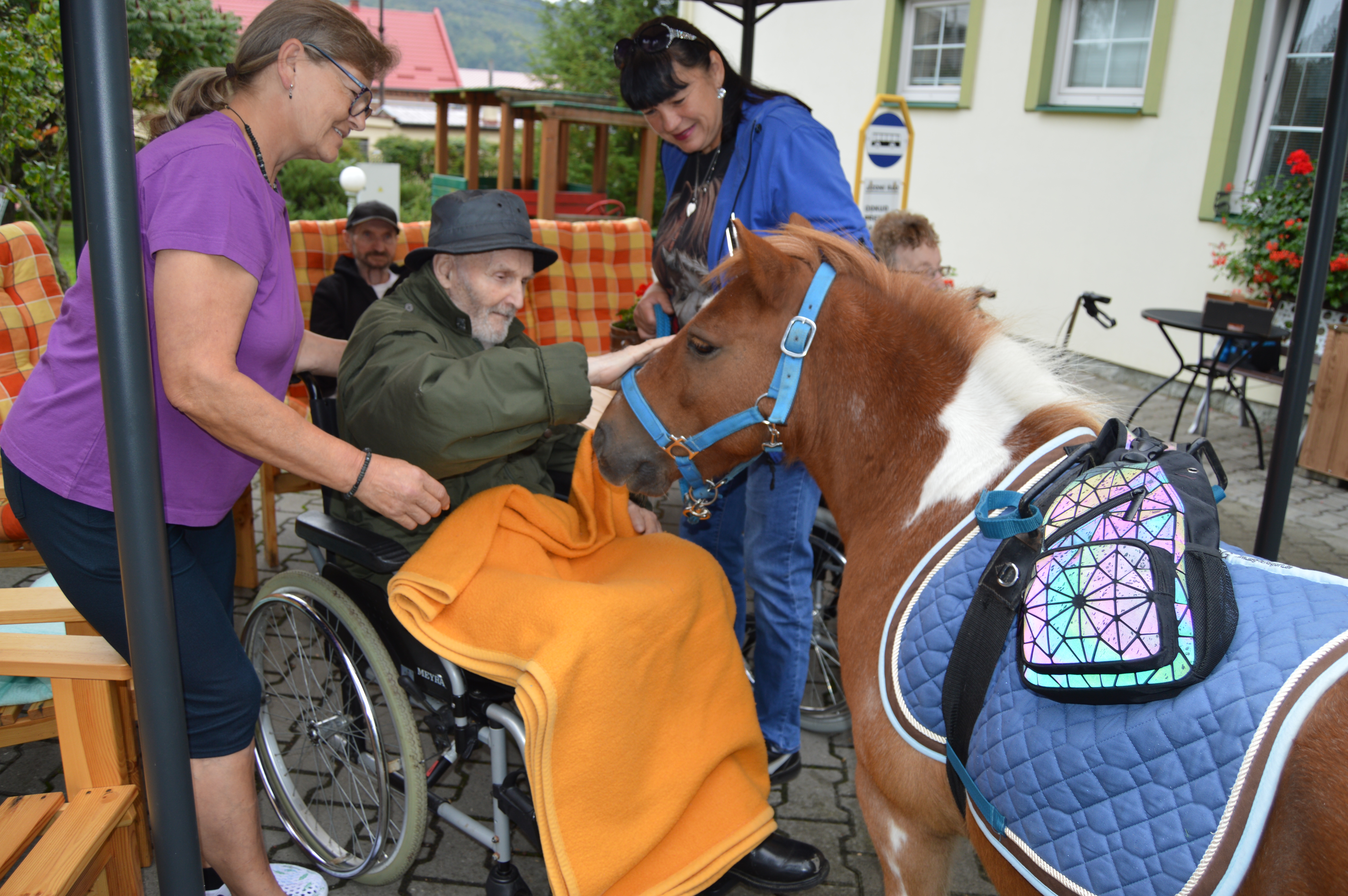 Ve středu 14.9. čekala naše klienty návštěva poníka Ondráška s jeho majitelkou paní Soňou Matuškovou. Návštěvy zvířátek v Domově jsou u uživatelů velmi oblíbené. I přes nepříznivé deštivé počasí uživatelé poníka netrpělivě vyhlíželi. Paní Soňa uživatelům pověděla mnoho zajímavostí a informací o Shetlandském poníkovi. Nakonec se mohli s Ondráškem pomazlit, hlazení poníka nebralo konce. Dokonce si uživatelka troufla a zvedla poníkovi nohu. Uživatelé si procvičili jemnou motoriku rukou česáním hřívy nebo krmením Ondry mrkvičkou a jablíčkem. Také si přáli, aby se mohli na památku s poníkem vyfotit. Uživatelé si setkání s poníkem velmi užívali, na jejich tvářích byly úsměvy, doufáme, že nás opět brzy navštíví.