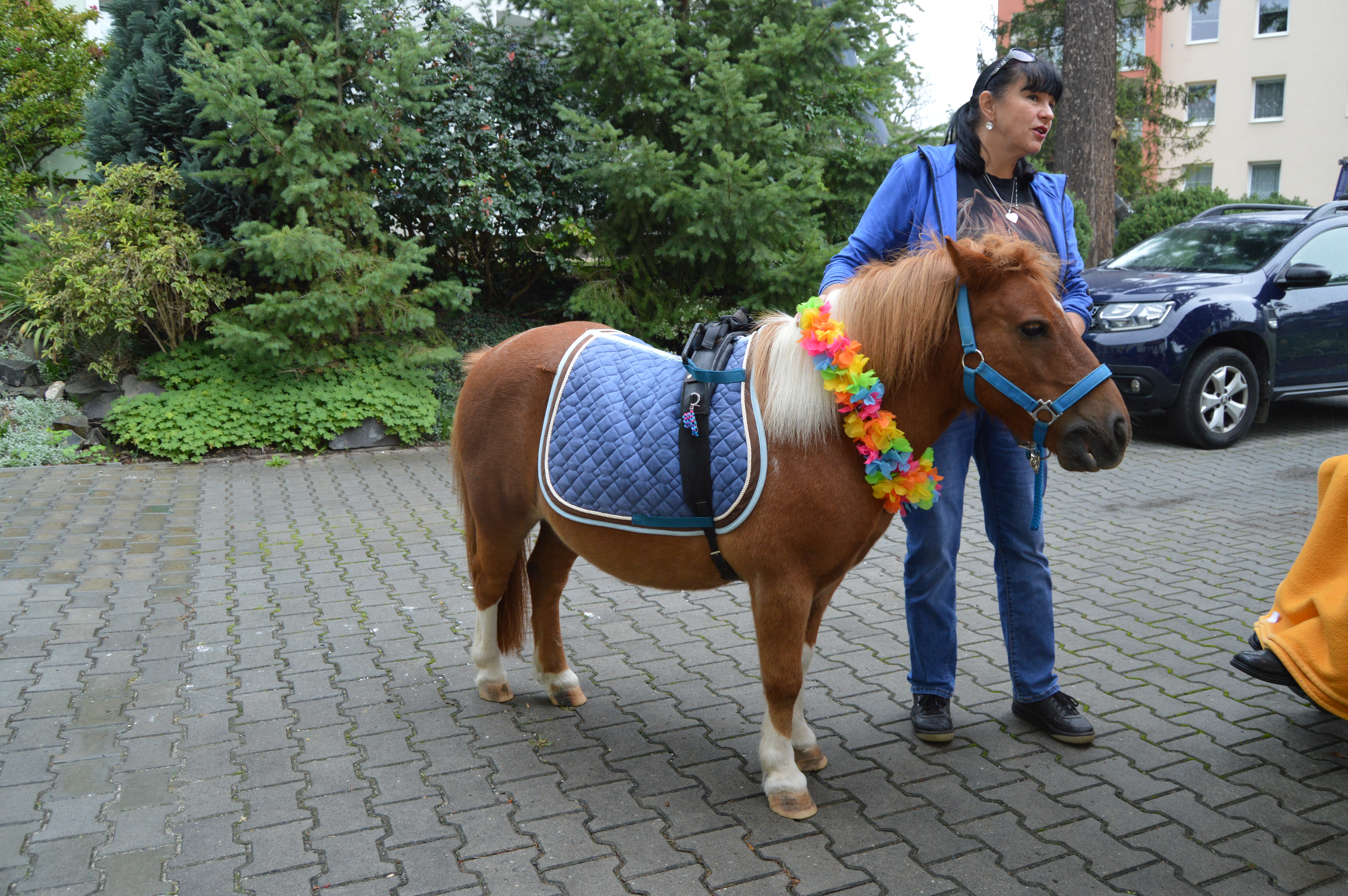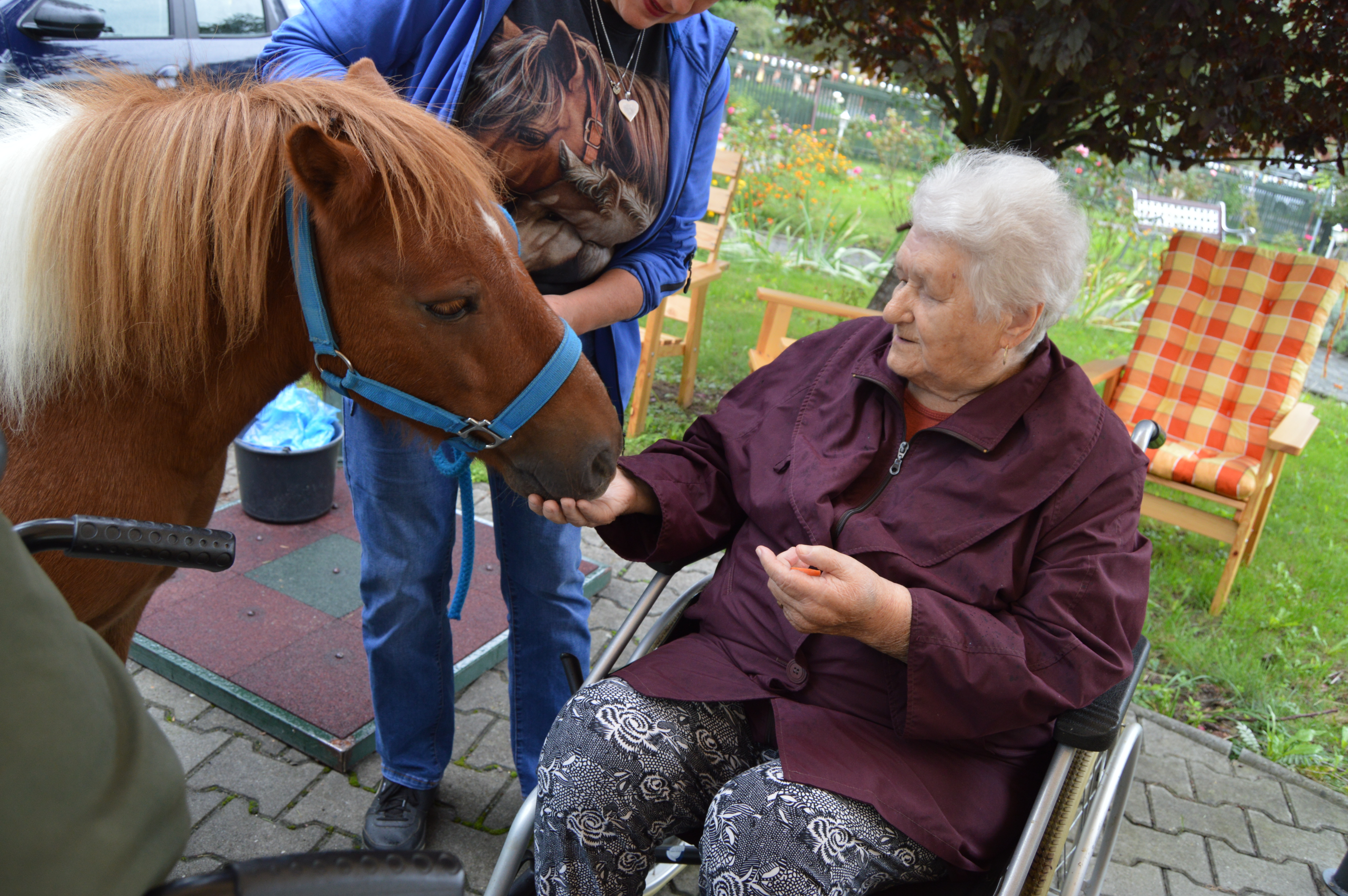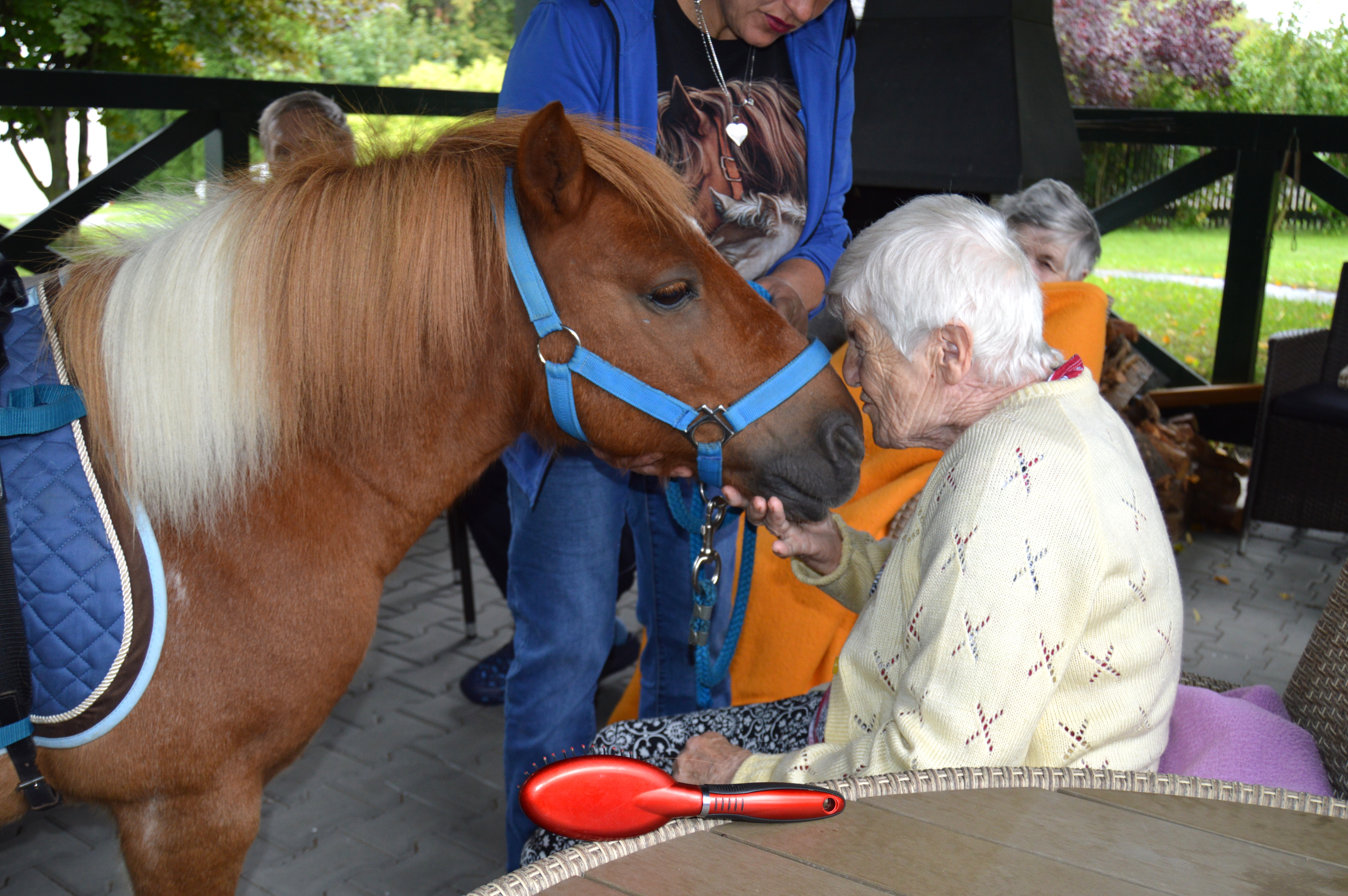 Ve středu 14.9. čekala naše klienty návštěva poníka Ondráška s jeho majitelkou paní Soňou Matuškovou. Návštěvy zvířátek v Domově jsou u uživatelů velmi oblíbené. I přes nepříznivé deštivé počasí uživatelé poníka netrpělivě vyhlíželi. Paní Soňa uživatelům pověděla mnoho zajímavostí a informací o Shetlandském poníkovi. Nakonec se mohli s Ondráškem pomazlit, hlazení poníka nebralo konce. Dokonce si uživatelka troufla a zvedla poníkovi nohu. Uživatelé si procvičili jemnou motoriku rukou česáním hřívy nebo krmením Ondry mrkvičkou a jablíčkem. Také si přáli, aby se mohli na památku s poníkem vyfotit. Uživatelé si setkání s poníkem velmi užívali, na jejich tvářích byly úsměvy, doufáme, že nás opět brzy navštíví.