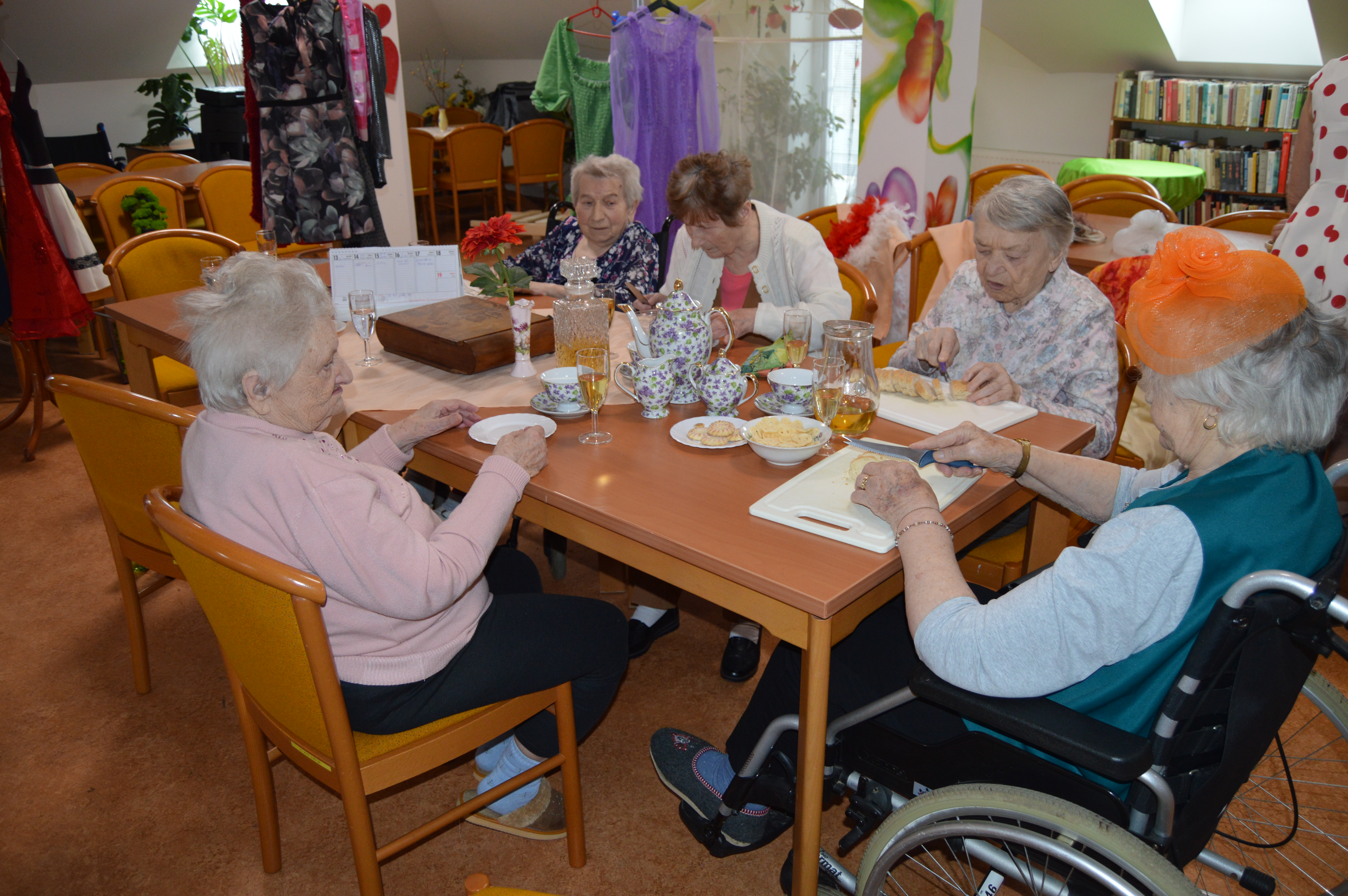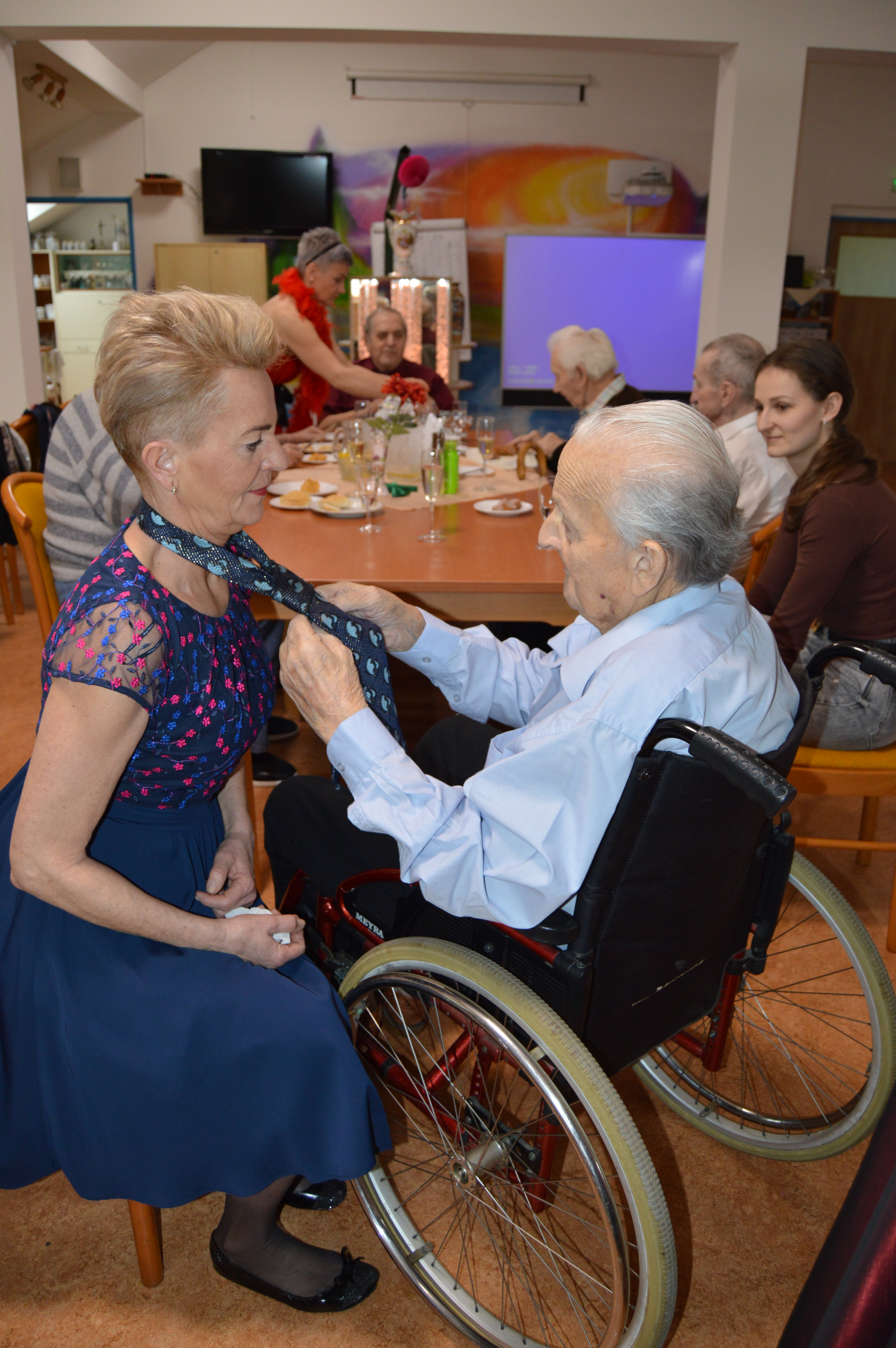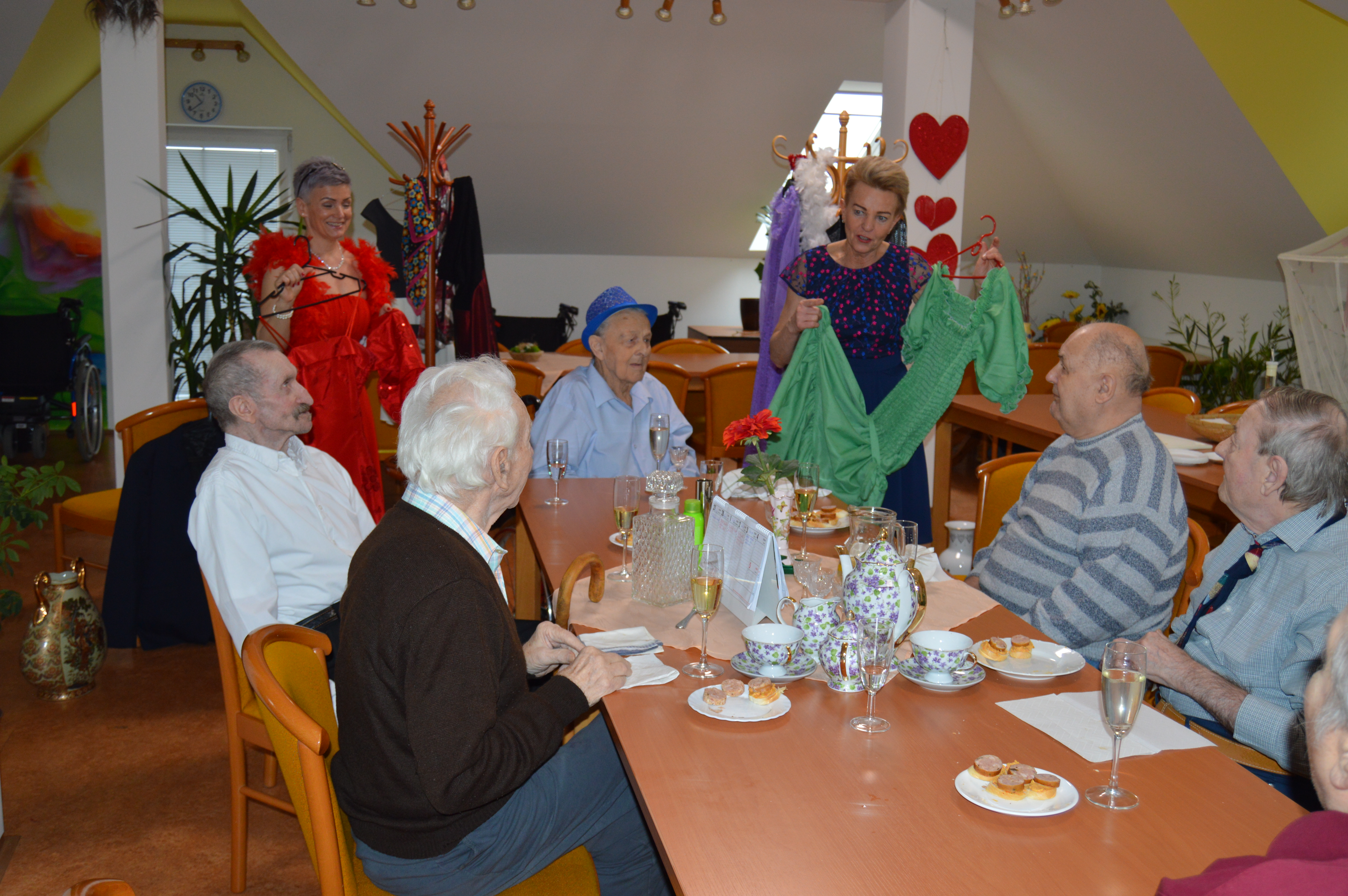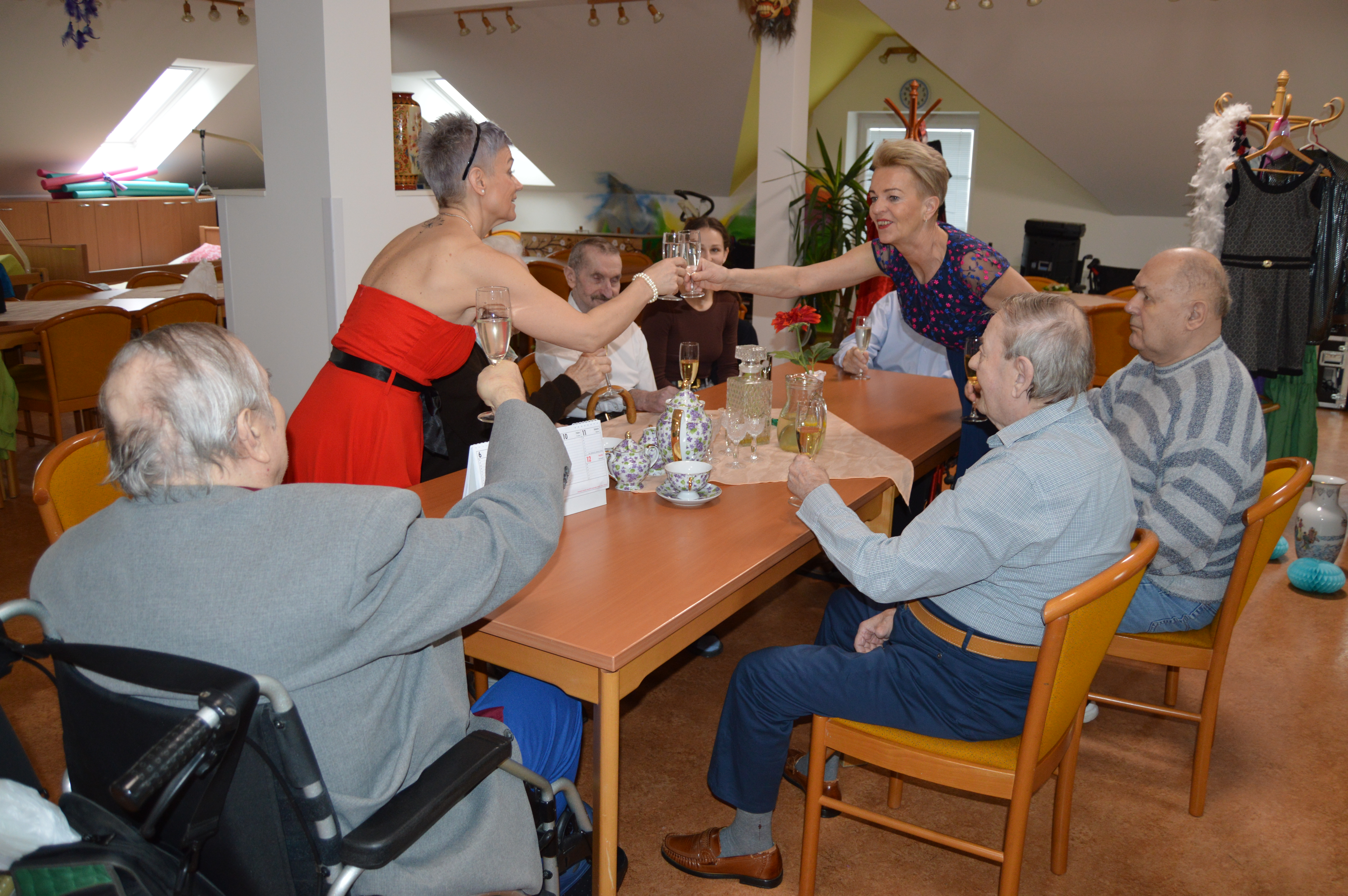 Před blížícím se tradičním plesem v Domově pro uživatele a jejich blízké si naše animační pracovnice připravily pro klienty reminiscenci na téma plesová sezóna. Akci udělaly hned na dvakrát, jednou se sešly jen s uživatelkami a poté zase jen s uživateli. Všichni se hodili do gala a při sklence vína a poslechu hudby si zavzpomínali na dobu, kdy vyrazili poprvé na ples, jak se oblékli, s kým se tam vydali, co se hrálo, jedlo, pilo a jestli tancovali. Všichni se rozvyprávěli s úsměvem na tváři, někteří na sebe prozradili dost zajímavé historky. Poté si i procvičili jemnou motoriku rukou nachystáním tradičních jednohubek s pomazánkou a klobáskou a pánové navíc ukázali, jak si uměli sami uvázat kravatu. Všem se dopoledne velice líbilo a všichni už se nemohou dočkat plesu.