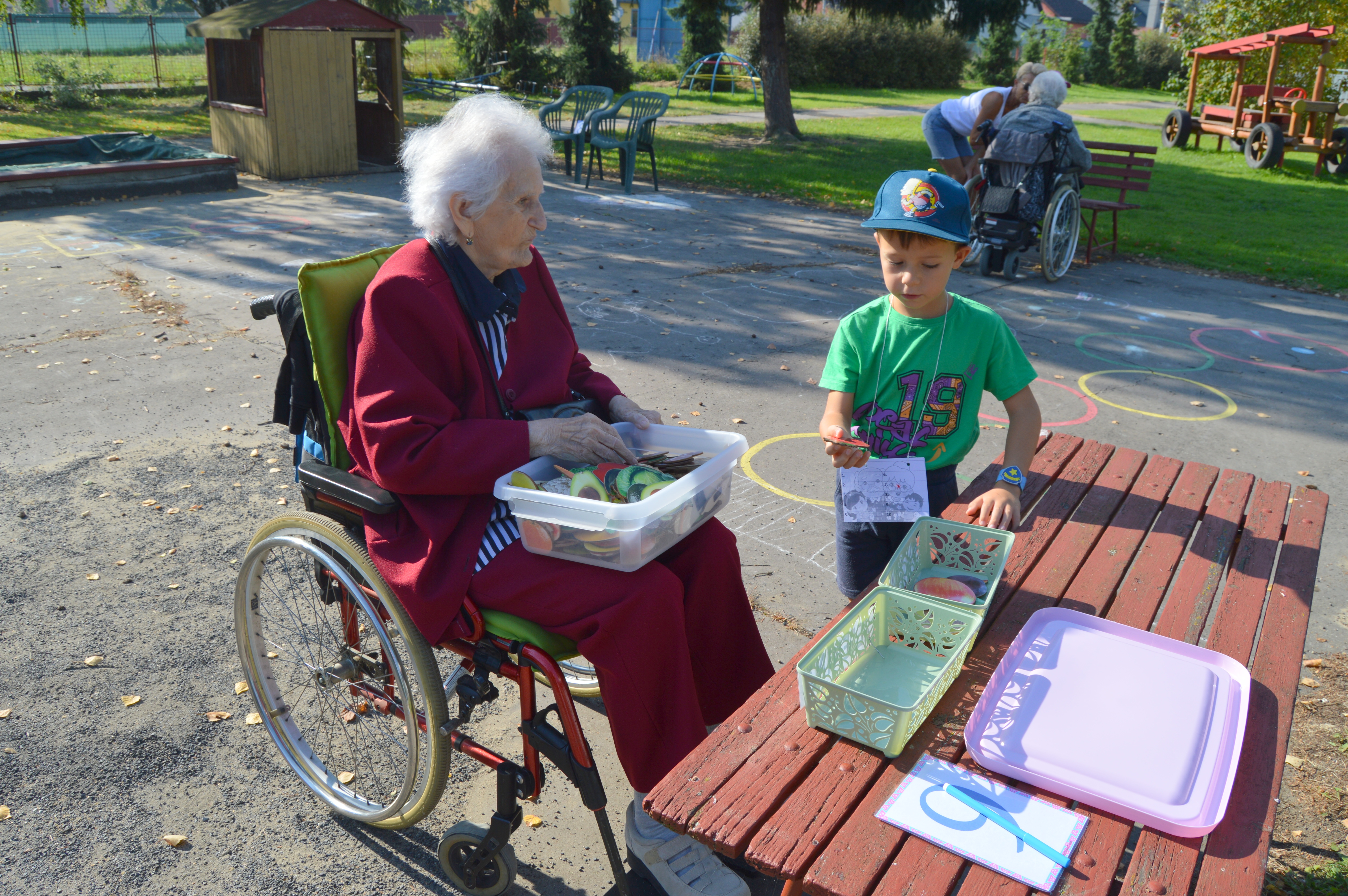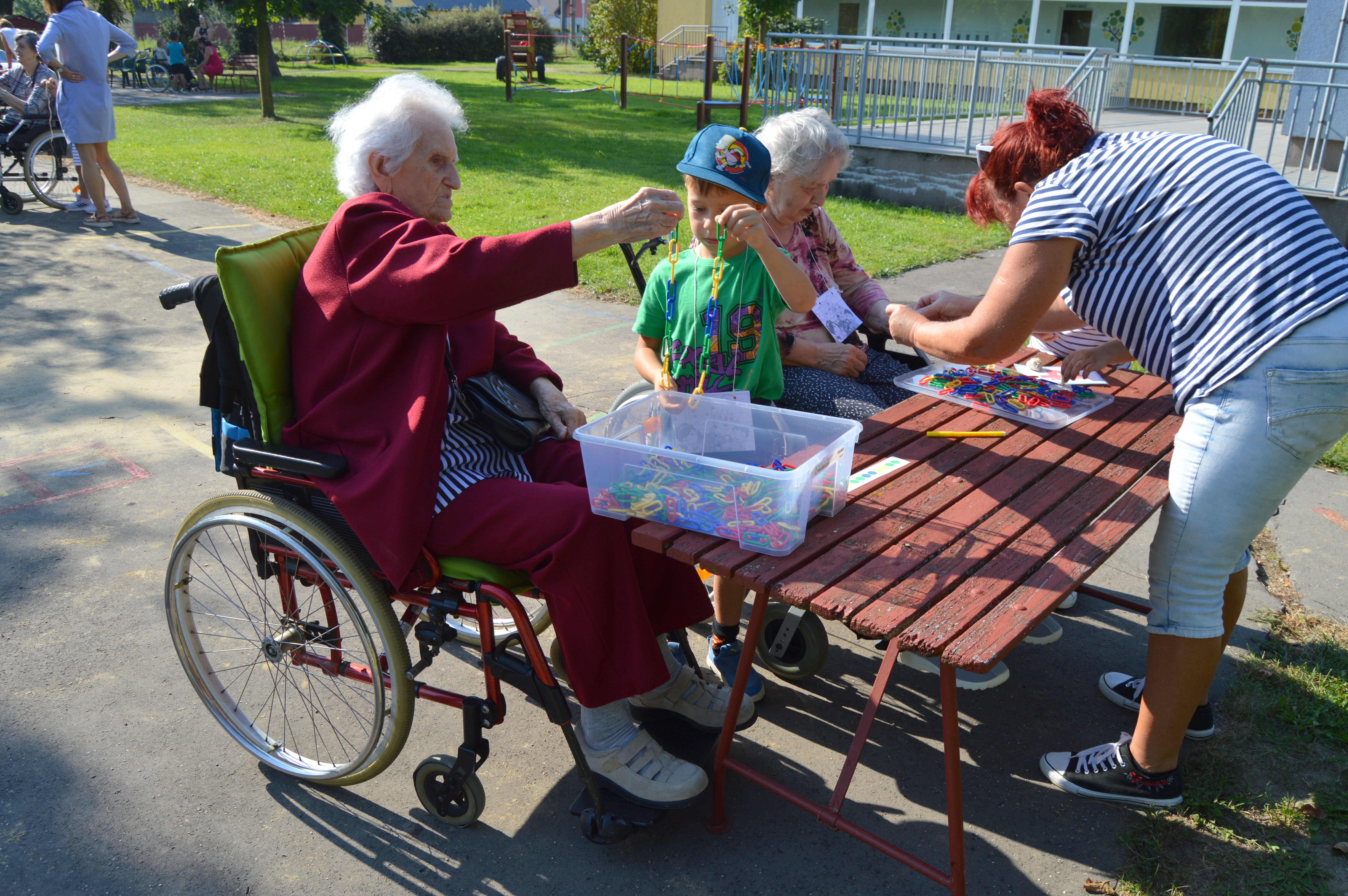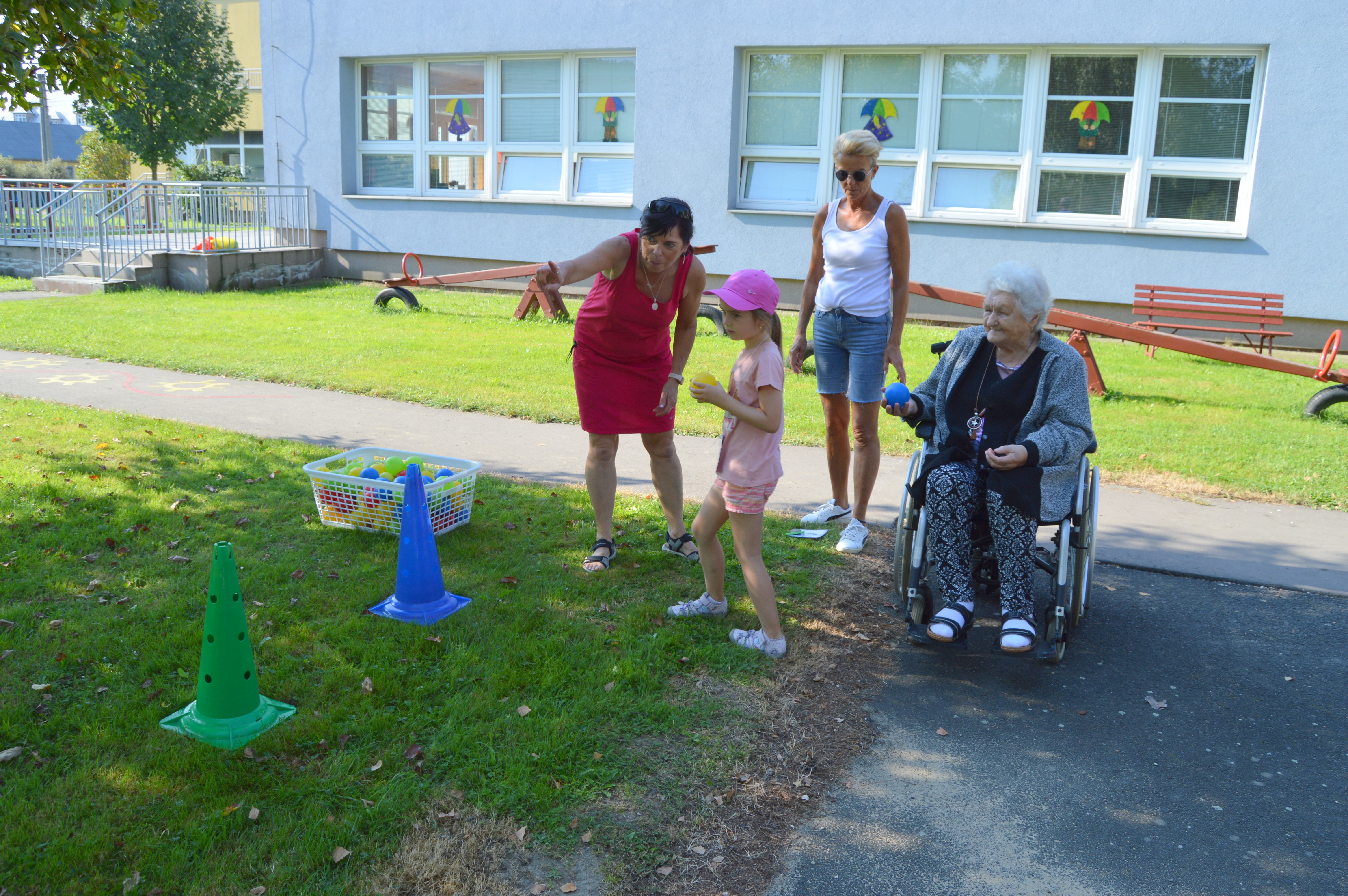 Ve středu 13.9. jsme se s našimi uživatelkami vydaly do Mateřské školy Čtyřlístek v Odrách, kde pro ně a děti bylo zorganizováno sportovní dopoledne. Naše seniorky se už shledání s dětmi nemohly dočkat. Při příjezdu ke školce jsme už z dálky viděly natěšené děti, jak na nás netrpělivě čekají, aby si s námi užily dopoledne plné her. Zpočátku se děti s našimi seniorkami pozdravily, poté se rozdělily do týmů, kde tým vždy tvořila jedna seniorka a jedno dítě. Dvojice se pustily do realizace společných úkolů. Jako například společné zpívání známé písničky, kreslení prstem na záda, poznávání obrázků ovoce a zeleniny, skládání puzzlí, házení kroužků a mnoho dalších. Byla radost sledovat naše klientky společně s dětmi, jak se snaží všechny úkoly poctivě plnit. Jak měli všichni splněno, tak se společně vrhli na bohaté pohoštění, které bylo přichystáno. Na závěr každé dítě předalo malý dáreček svému spoluhráči a následně i děti dostaly malou pozornost od svých učitelek a od nás z Domova balík bonbónů. Všichni přítomní si dopoledne velmi užili. Děkujeme učitelkám Mateřské školy za pozvání a organizaci akce. Budeme se těšit na příští shledání.