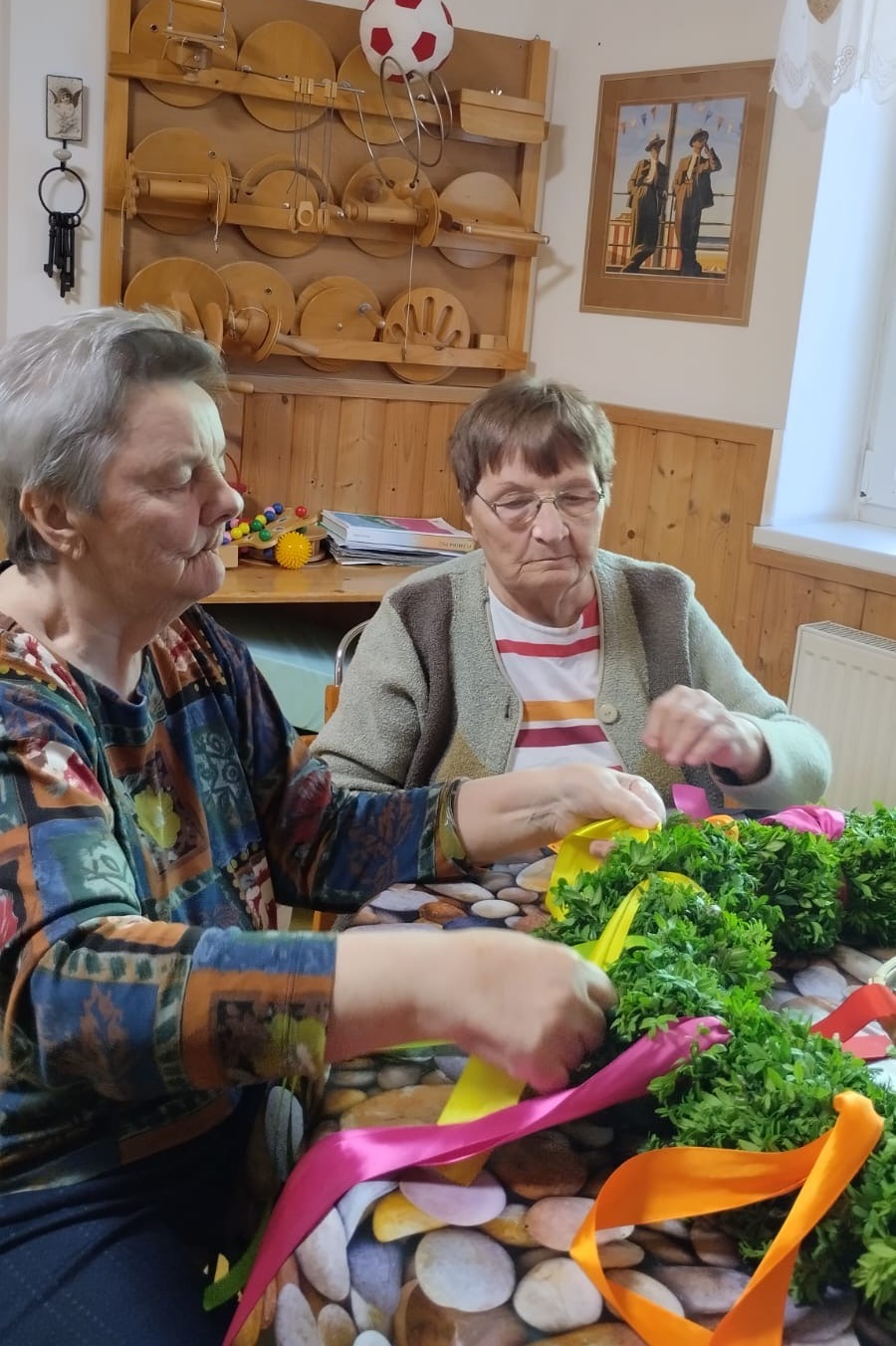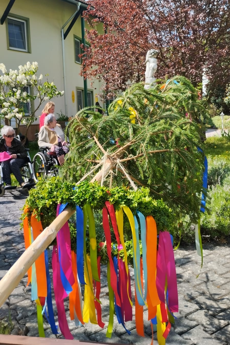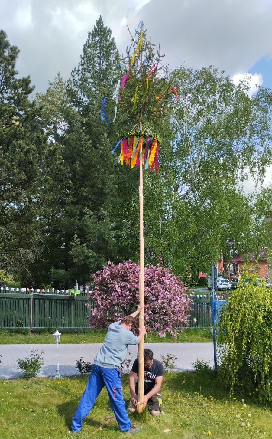 Májka se staví obvykle 30.dubna nebo 1.května a představuje symbol jara, lásky, plodnosti a vitality. Tuto tradici u nás v Domově dodržujeme každý rok. Naše domovská májka každoročně vítá všechny řidiče přijíždějící od Hranic do konce května, kdy je slavnostně poražena. Aby tomu tak mohlo být i letos, vydali se poslední dubnový den pracovníci Domova pro mladý smrček do lesa. Sluneční paprsky prohřívaly vzduch a uživatelé se těšili, až ho zaměstnanci přivezou. Poté se s nadšením pustili do zdobení májky. Zatímco přivazovali barevné stuhy na věnec, povídali si a vzpomínali, zda města a obce, ze kterých do Domova přišli, tuto tradici dodržovaly. Jakmile byla májka nazdobená, naši údržbáři ji postavili. Odpoledne už májka stála na svém místě a bude čekat celý měsíc na slavnostní pokácení.