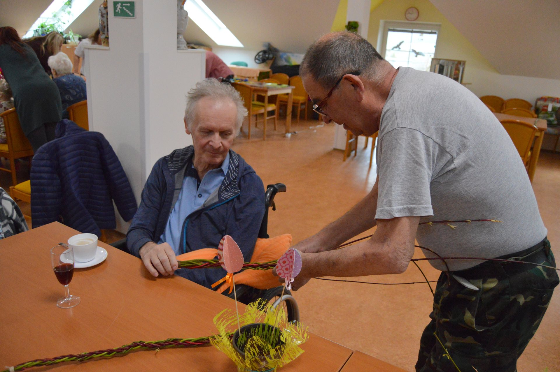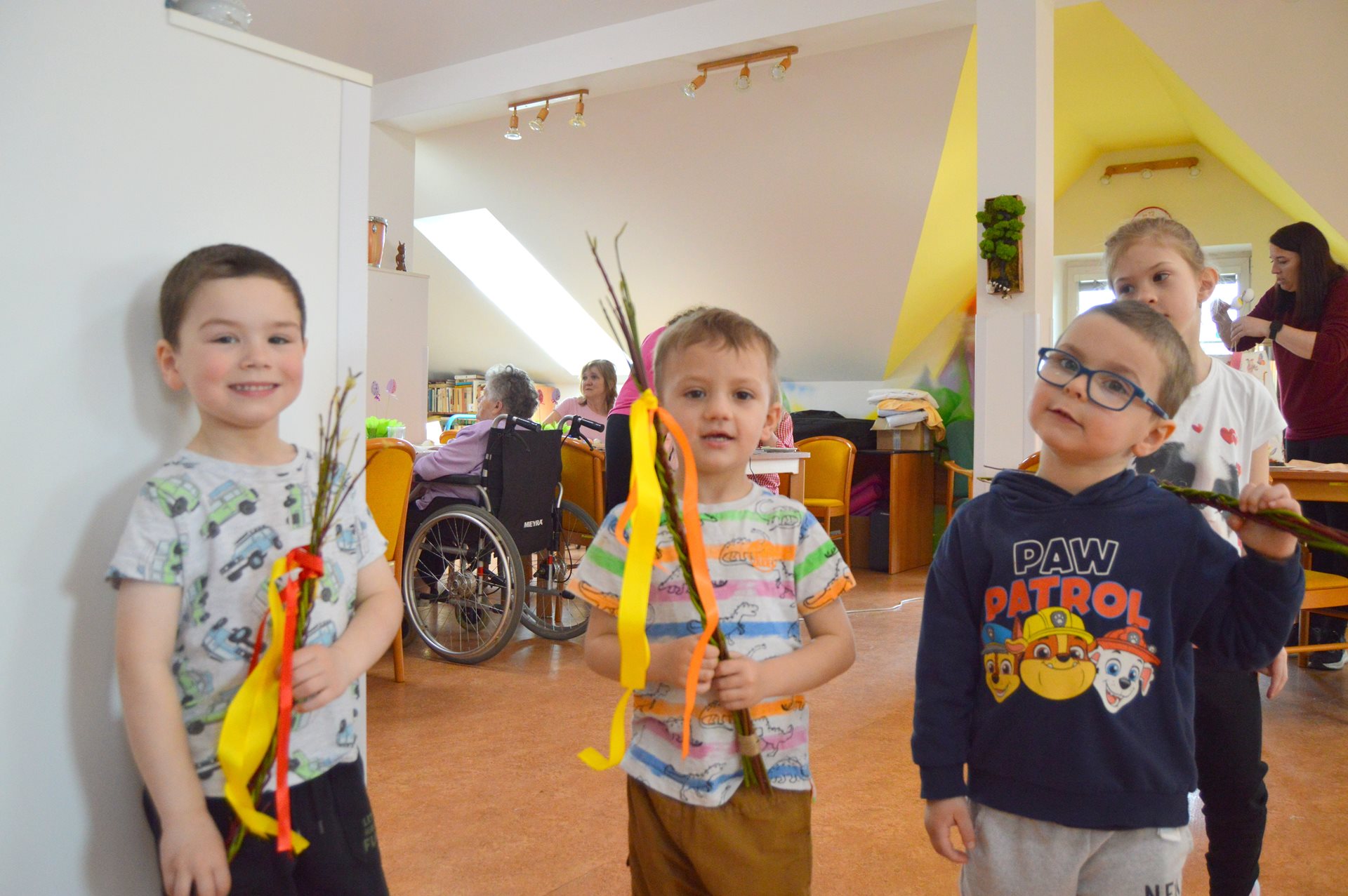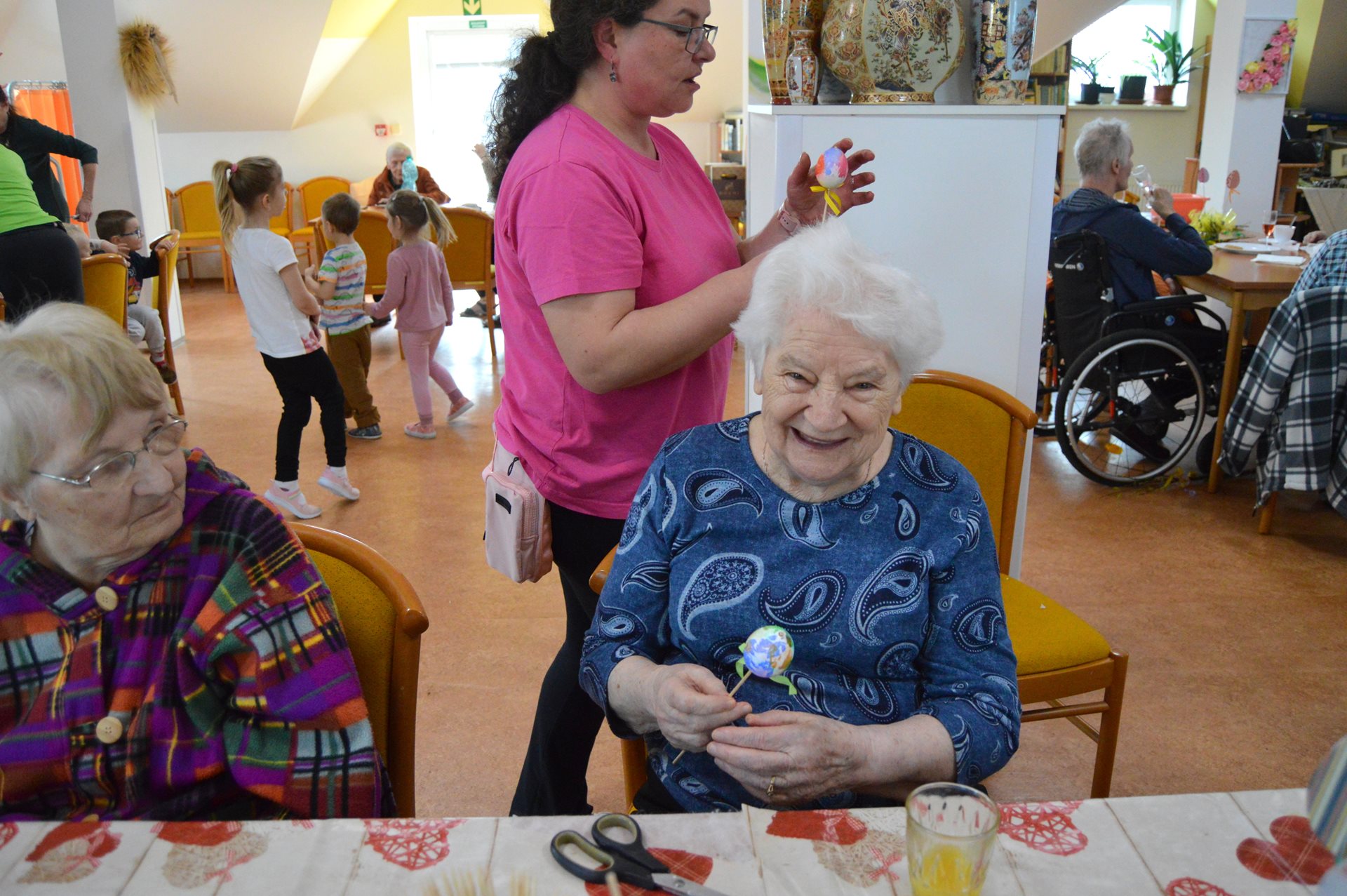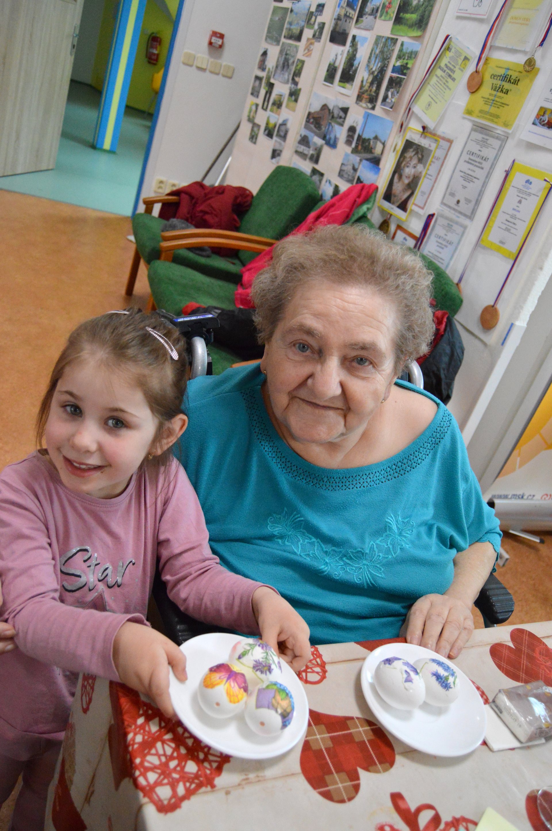 Ve středu 1. dubna jsme u nás opět s radostí přivítali milou návštěvu dětí z Mateřské školy Čtyřlístek. Sešli jsme se na Tančírně ve Vile a společně jsme si užili krásné velikonoční dopoledne plné tvoření, smíchu a milých setkání. Děti spolu s našimi uživatelkami zdobily vajíčka a bylo nádherné sledovat, s jakým nadšením a fantazií se pouštěly do práce. Každé vajíčko bylo originální a vznikalo s velkou pečlivostí a radostí. Mezitím se chlapcům i našim pánům věnoval pan Stecula, který je učil plést pomlázky. Patří mu velké poděkování za jeho čas, ochotu a trpělivost. Děti si své pomlázky hrdě odnesly domů. Nechybělo ani malé občerstvení, na které se děti vždy těší – jak nám s úsměvem prozradila paní učitelka. Celé dopoledne se neslo v pohodové a přátelské atmosféře. Pánové si při pletení zpříjemnili chvíle sklenkou vína a u stolů mezitím vznikala krásná barevná vajíčka. Bylo opravdu dojemné sledovat, jak se propojují generace – jak si děti a senioři navzájem pomáhají, povídají si a společně tvoří. Takové chvíle mají velkou hodnotu pro nás všechny. Děti i naši uživatelé si setkání moc užili a na jejich tvářích byla vidět upřímná radost. Už teď se těšíme na další společné chvíle.