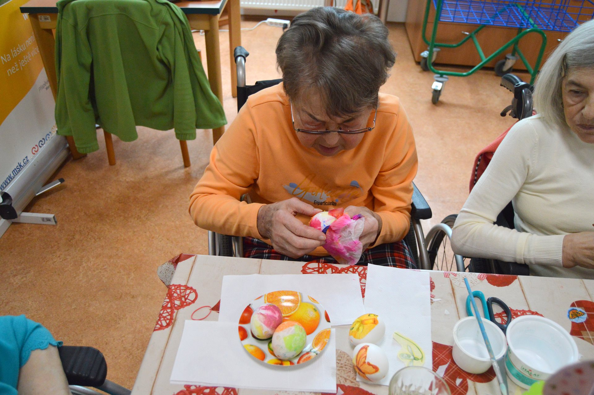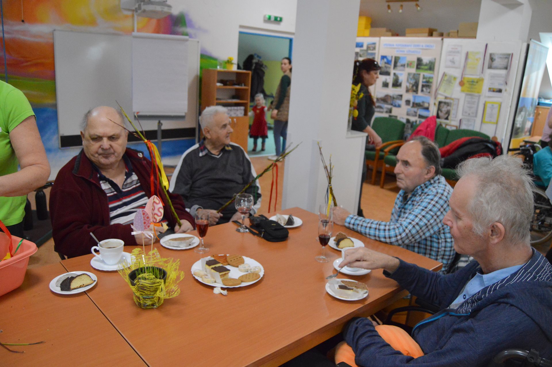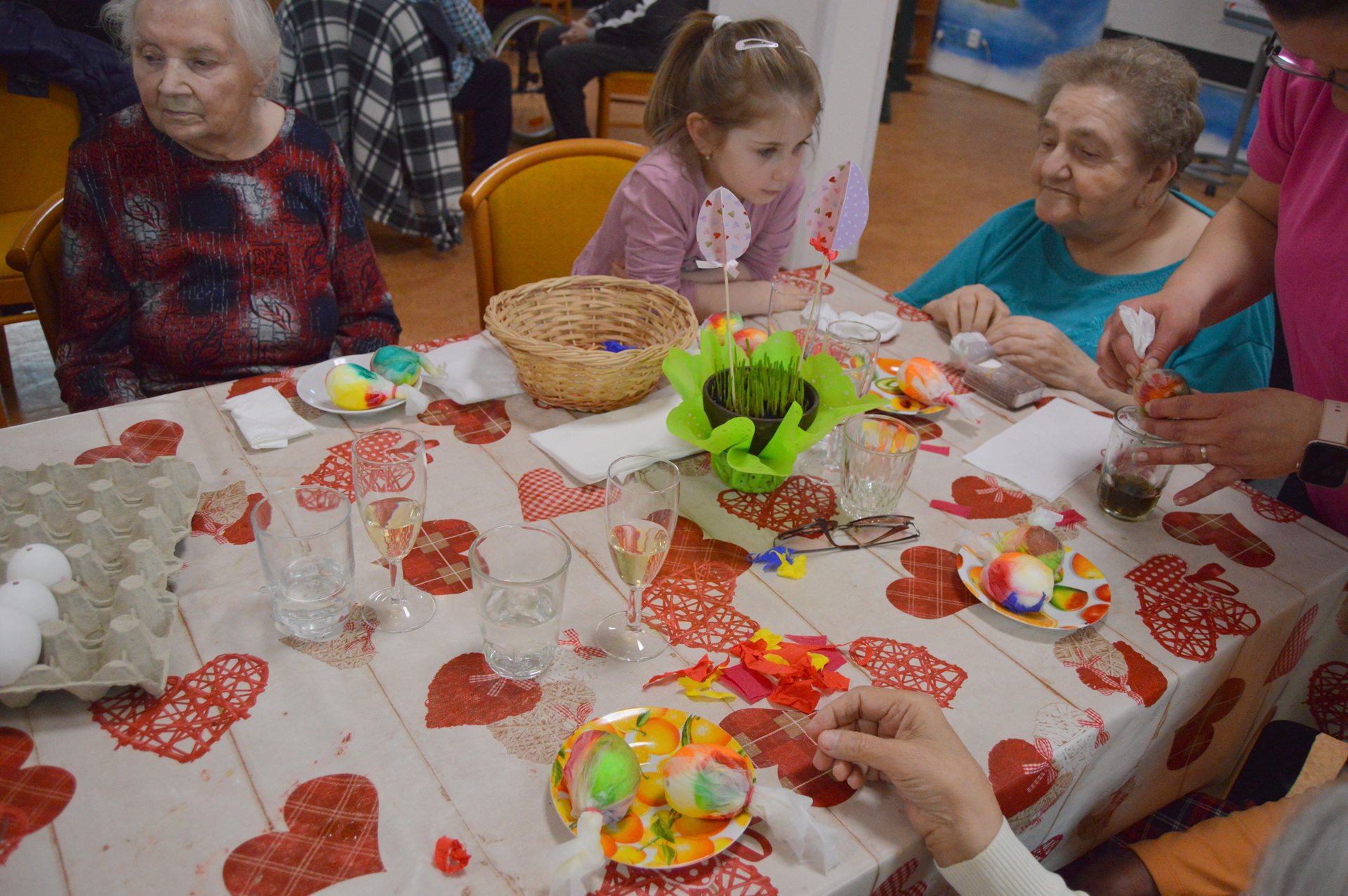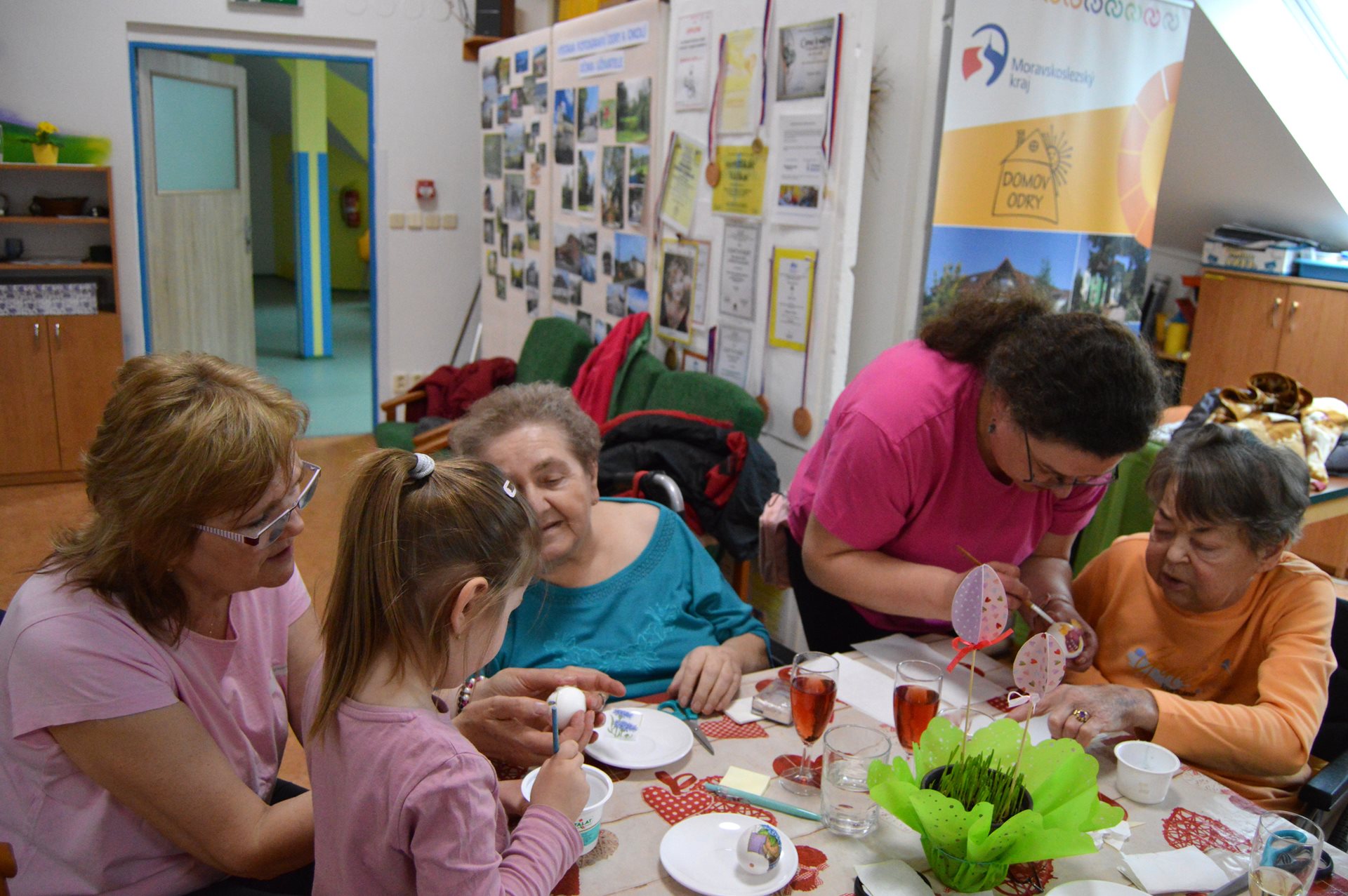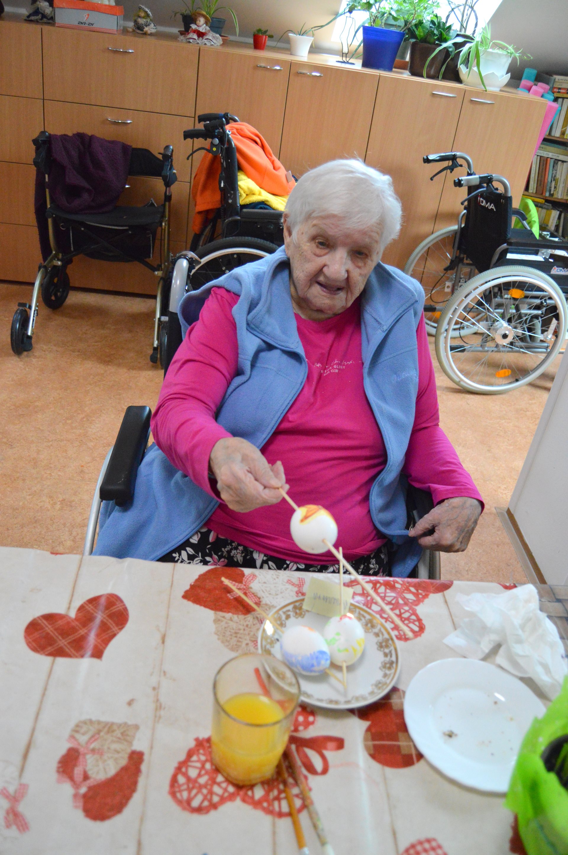 Ve středu 1. dubna jsme u nás opět s radostí přivítali milou návštěvu dětí z Mateřské školy Čtyřlístek. Sešli jsme se na Tančírně ve Vile a společně jsme si užili krásné velikonoční dopoledne plné tvoření, smíchu a milých setkání. Děti spolu s našimi uživatelkami zdobily vajíčka a bylo nádherné sledovat, s jakým nadšením a fantazií se pouštěly do práce. Každé vajíčko bylo originální a vznikalo s velkou pečlivostí a radostí. Mezitím se chlapcům i našim pánům věnoval pan Stecula, který je učil plést pomlázky. Patří mu velké poděkování za jeho čas, ochotu a trpělivost. Děti si své pomlázky hrdě odnesly domů. Nechybělo ani malé občerstvení, na které se děti vždy těší – jak nám s úsměvem prozradila paní učitelka. Celé dopoledne se neslo v pohodové a přátelské atmosféře. Pánové si při pletení zpříjemnili chvíle sklenkou vína a u stolů mezitím vznikala krásná barevná vajíčka. Bylo opravdu dojemné sledovat, jak se propojují generace – jak si děti a senioři navzájem pomáhají, povídají si a společně tvoří. Takové chvíle mají velkou hodnotu pro nás všechny. Děti i naši uživatelé si setkání moc užili a na jejich tvářích byla vidět upřímná radost. Už teď se těšíme na další společné chvíle.