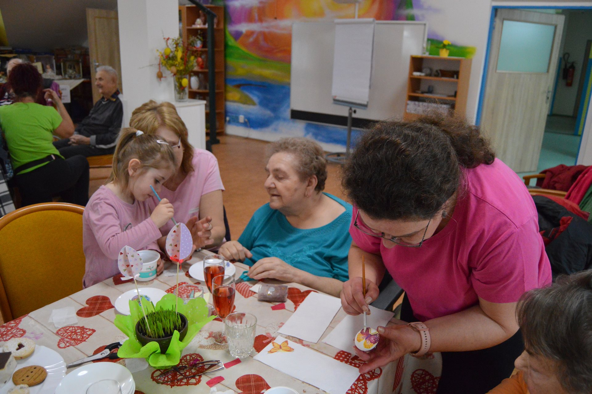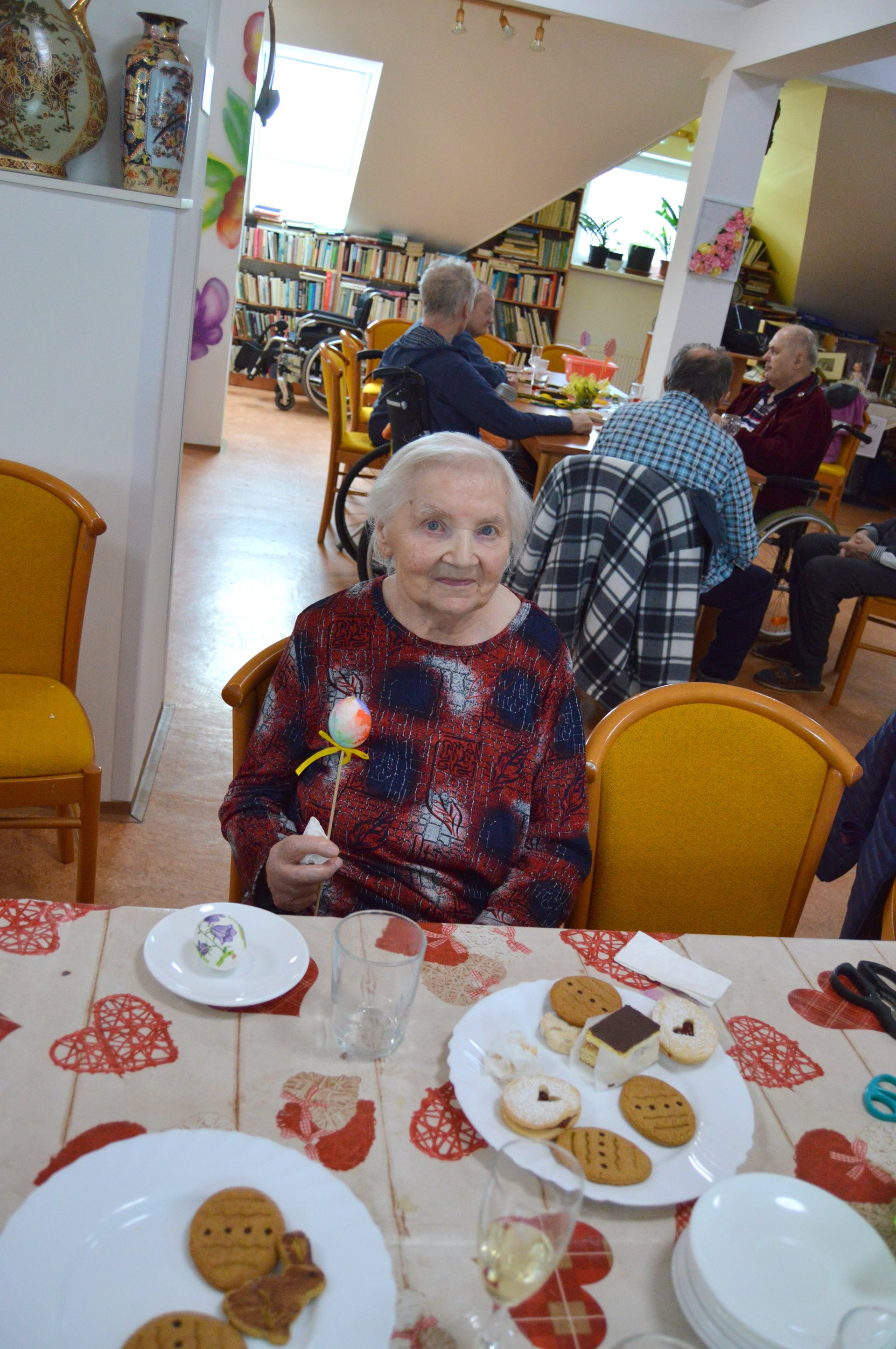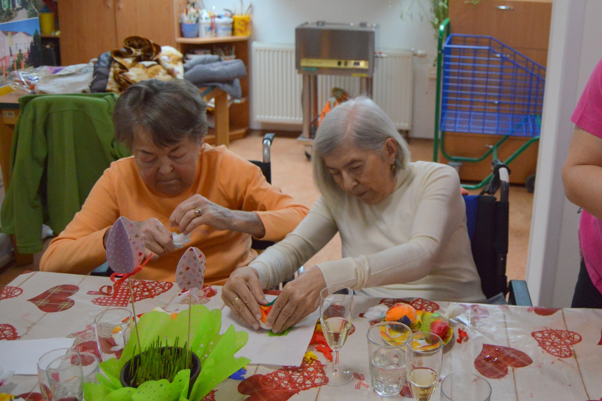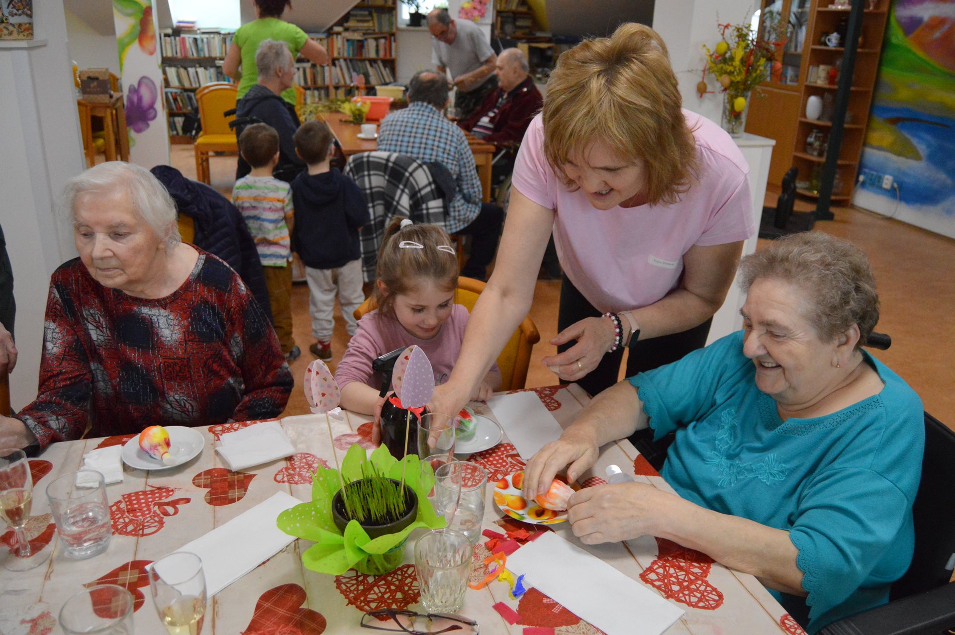 Ve středu 1. dubna jsme u nás opět s radostí přivítali milou návštěvu dětí z Mateřské školy Čtyřlístek. Sešli jsme se na Tančírně ve Vile a společně jsme si užili krásné velikonoční dopoledne plné tvoření, smíchu a milých setkání. Děti spolu s našimi uživatelkami zdobily vajíčka a bylo nádherné sledovat, s jakým nadšením a fantazií se pouštěly do práce. Každé vajíčko bylo originální a vznikalo s velkou pečlivostí a radostí. Mezitím se chlapcům i našim pánům věnoval pan Stecula, který je učil plést pomlázky. Patří mu velké poděkování za jeho čas, ochotu a trpělivost. Děti si své pomlázky hrdě odnesly domů. Nechybělo ani malé občerstvení, na které se děti vždy těší – jak nám s úsměvem prozradila paní učitelka. Celé dopoledne se neslo v pohodové a přátelské atmosféře. Pánové si při pletení zpříjemnili chvíle sklenkou vína a u stolů mezitím vznikala krásná barevná vajíčka. Bylo opravdu dojemné sledovat, jak se propojují generace – jak si děti a senioři navzájem pomáhají, povídají si a společně tvoří. Takové chvíle mají velkou hodnotu pro nás všechny. Děti i naši uživatelé si setkání moc užili a na jejich tvářích byla vidět upřímná radost. Už teď se těšíme na další společné chvíle.