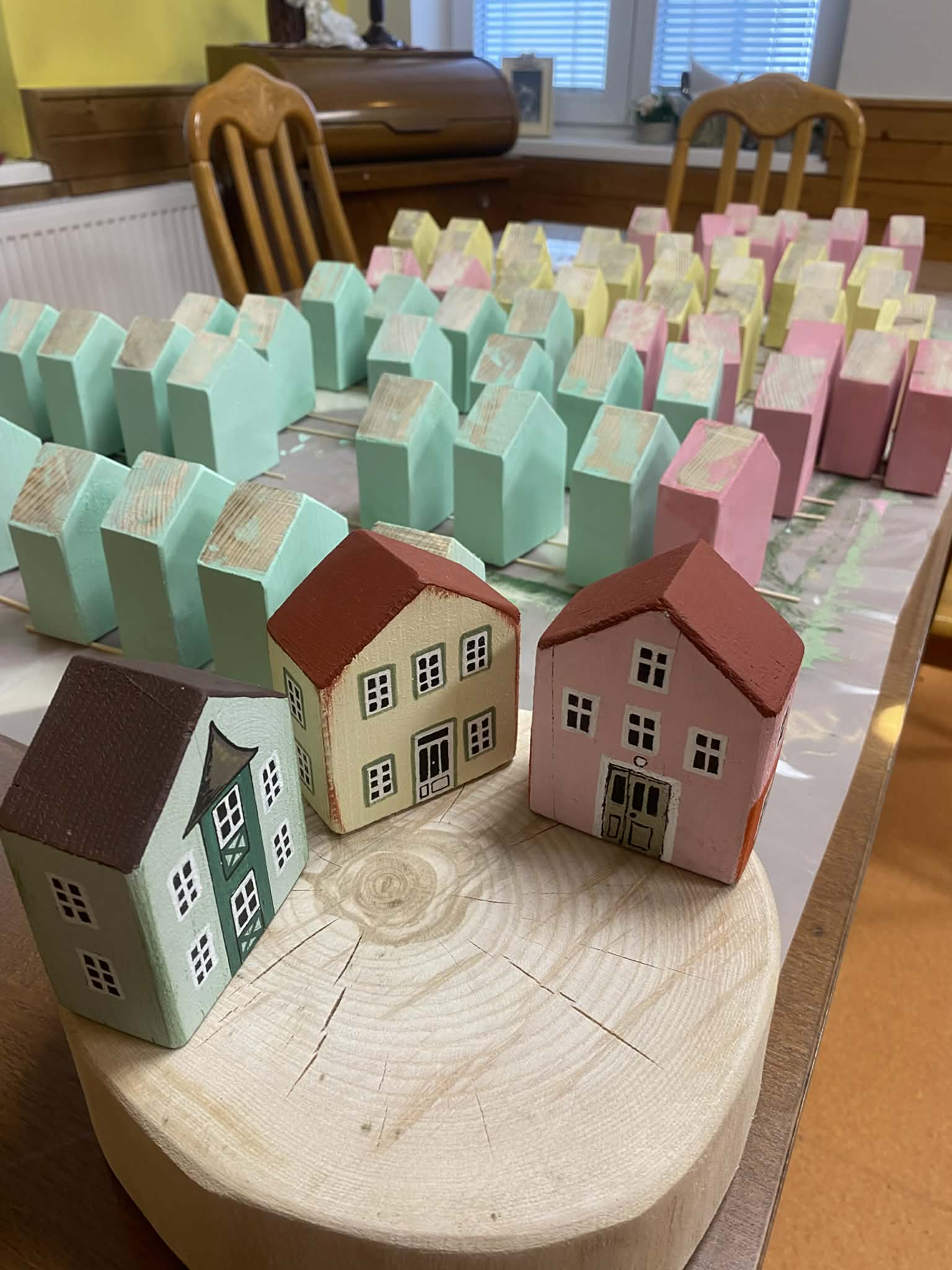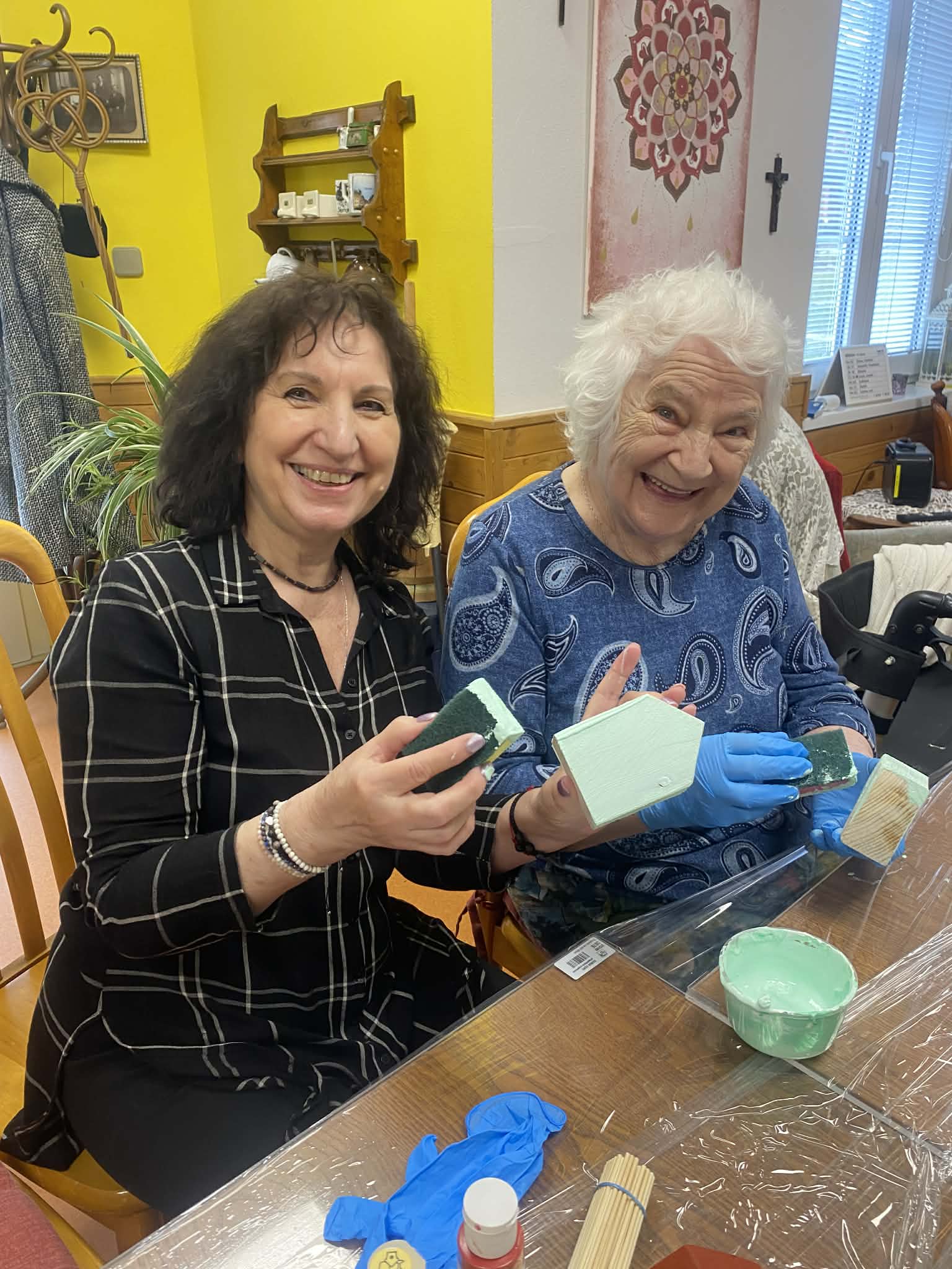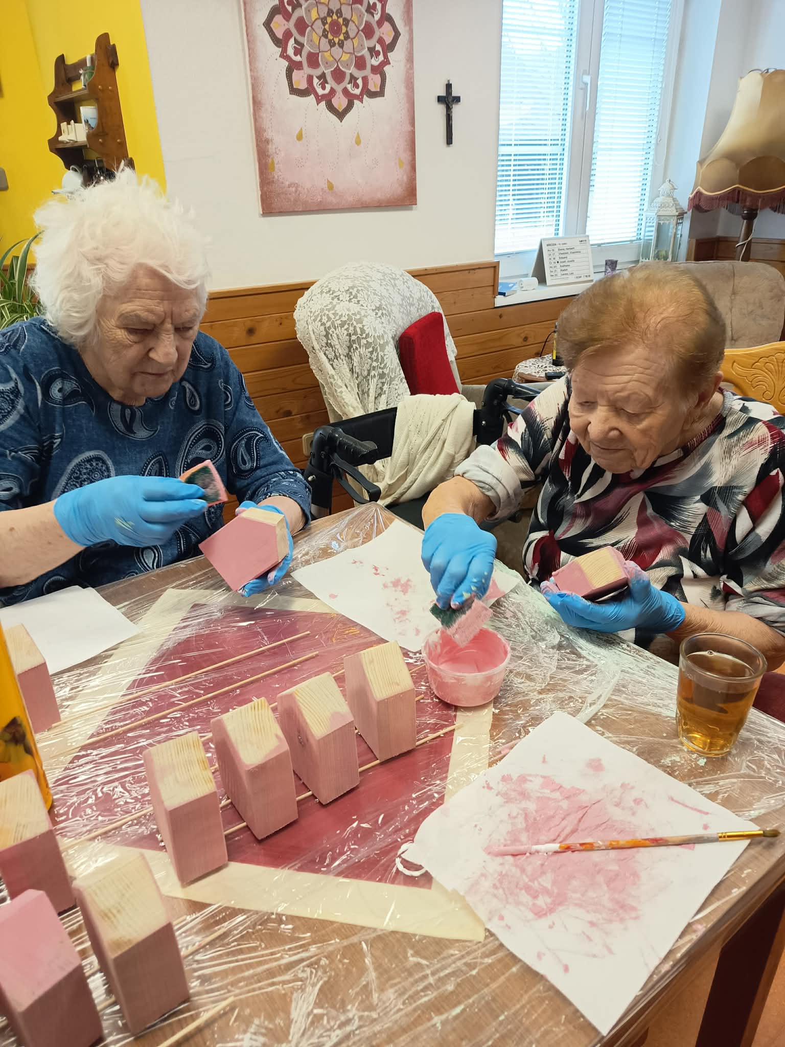 Ve středu 18. března jsme se sešly v jídelně na Vile, kde panovala příjemná a tvořivá atmosféra. Společně jsme se pustily do malování domečků v barvách našeho Domova – Vily, Domku i Kuchyně. Práce nás všechny velmi bavila, vzájemně jsme si pomáhaly, inspirovaly se a sdílely radost z tvoření. Velkou radost nám udělalo také zapojení členů rodiny, kteří přišli podpořit své blízké a strávit s námi příjemný čas. Díky jejich účasti měla celá akce ještě srdečnější a slavnostnější nádech. Všem patří velké poděkování za jejich snahu, kreativitu i dobrou náladu.